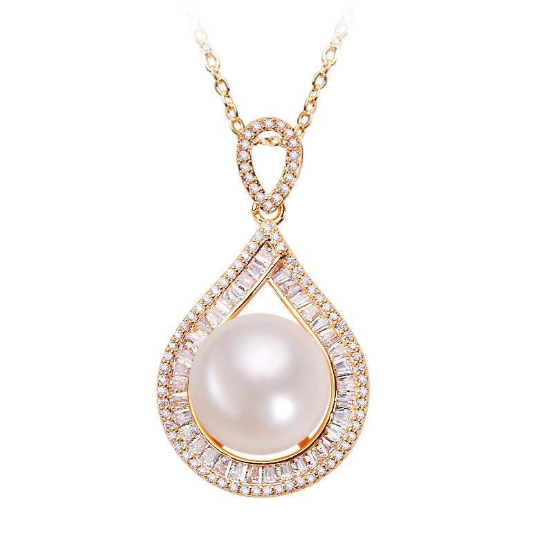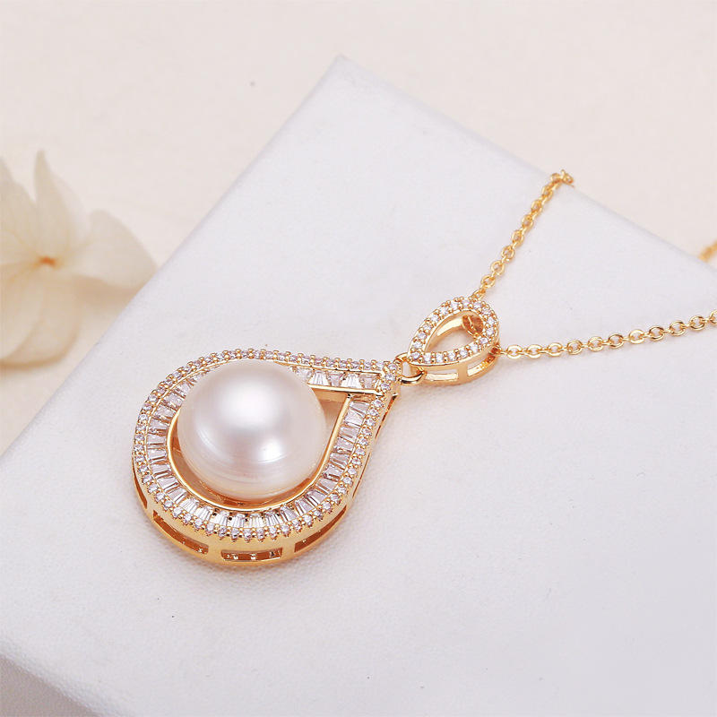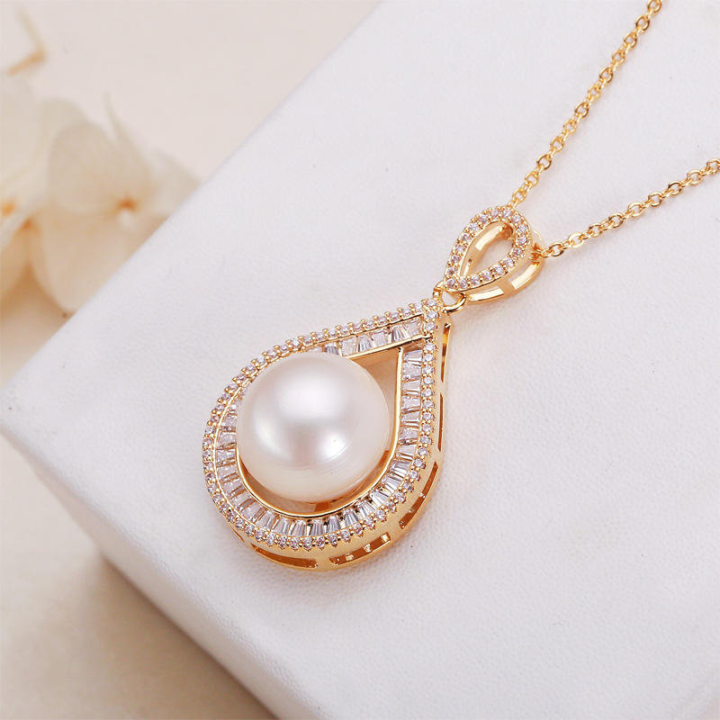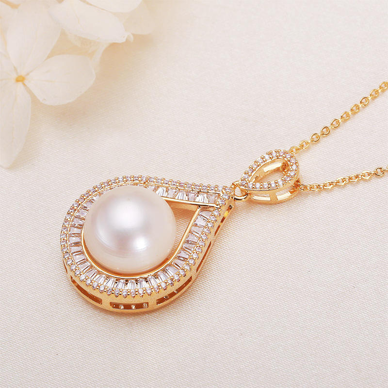 จี้ไข่มุกน้ำจืดแท้ ดีไซน์หยดน้ำ ประดับเพชรเต็มเม็ด ชุบทองใหม่ รูปทรงเรขาคณิต ทองแดง