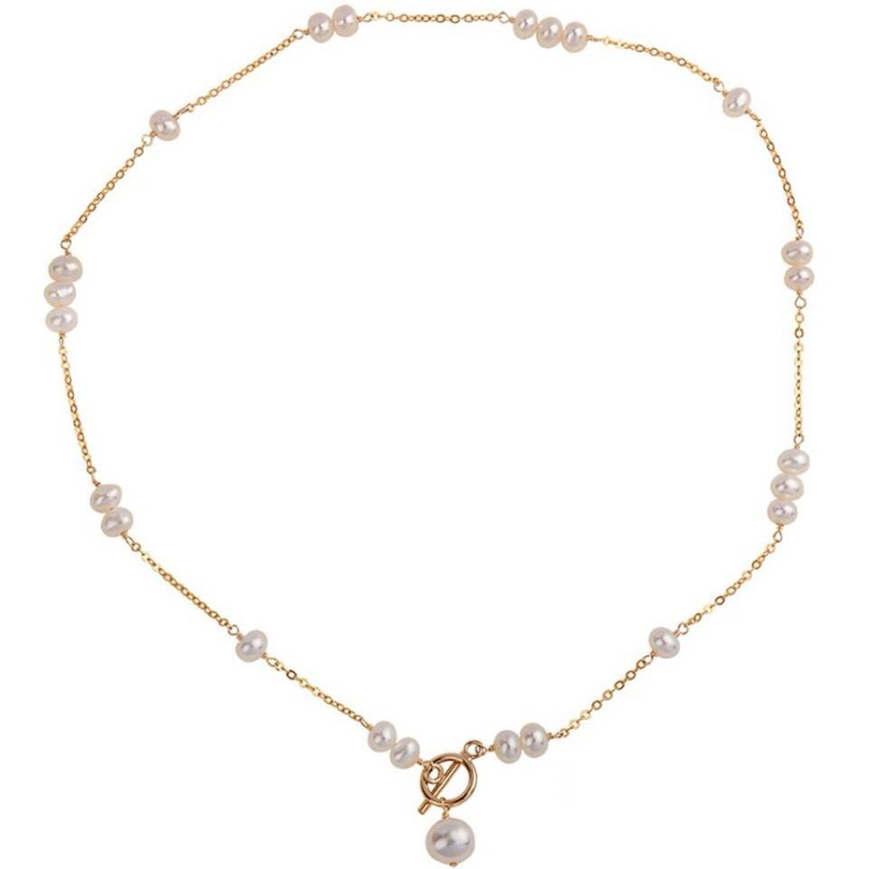 สร้อยคอมุกน้ำจืดธรรมชาติสไตล์หรูหราเบาๆ ชุบทอง 14K พร้อมตัวล็อคแบบ OT ดีไซน์เฉพาะ ปรับขนาดได้ เหมาะสำหรับใส่กับเสื้อสเวตเตอร์