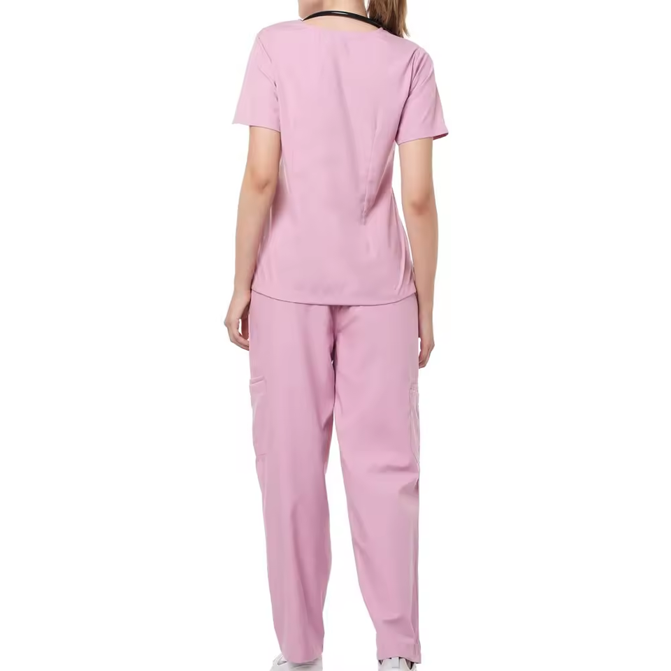 ชุดยูนิฟอร์มพยาบาลสีชมพูอ่อนสำหรับผู้หญิง เนื้อผ้านุ่มคล้ายผ้าฝ้าย เหมาะสำหรับบุคลากรทางทันตกรรมและด้านความงาม