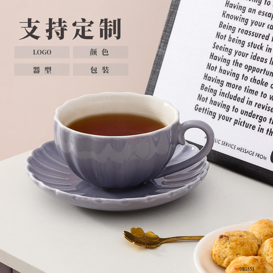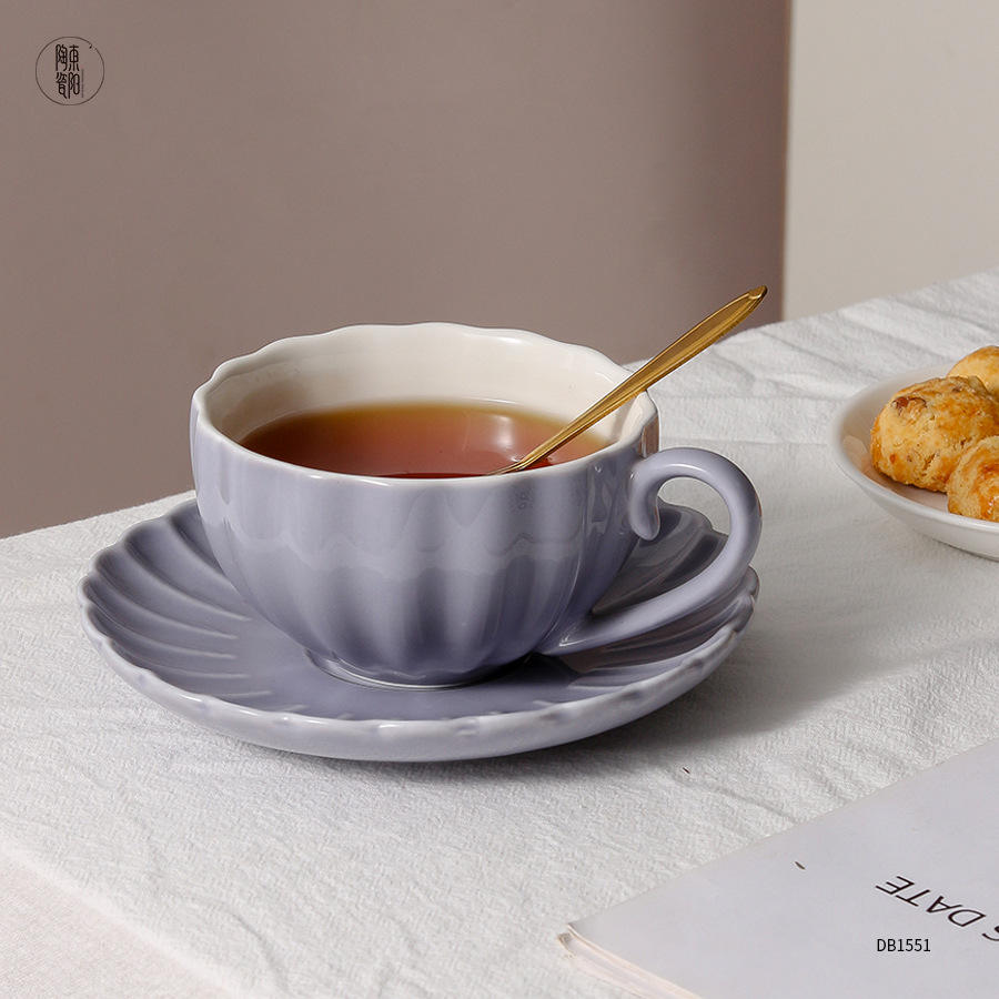 ชุดถ้วยกาแฟเซรามิกสีม่วงอ่อนพร้อมจานรองสไตล์นอร์ดิกสีทึบสำหรับงานปาร์ตี้ใช้ในบ้าน DB1551