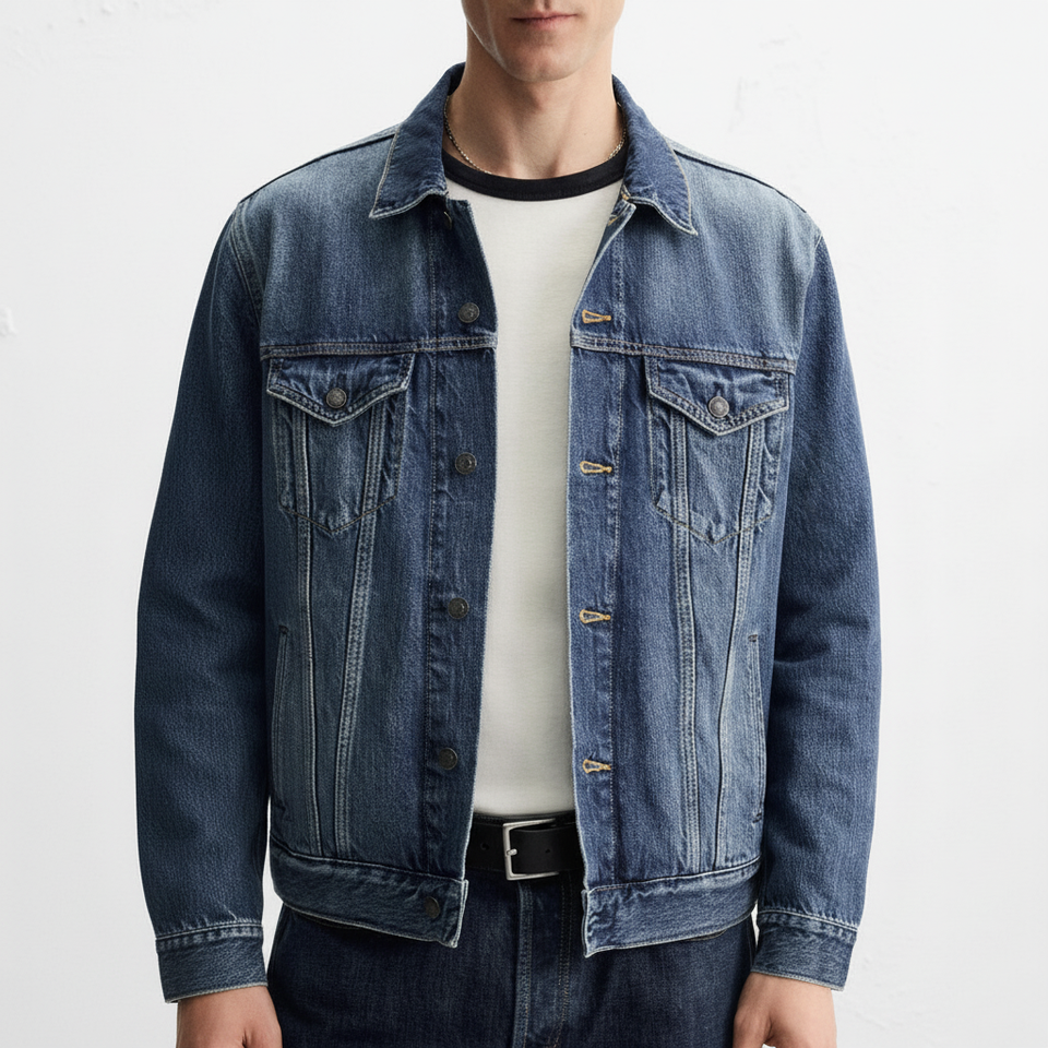 แจ็กเก็ตผ้ายีนส์ฟอกสีอ่อนสำหรับผู้ชายเนื้อนุ่มและตัดแบบคลาสสิกเหมาะสำหรับฤดูใบไม้ผลิและฤดูใบไม้ร่วง