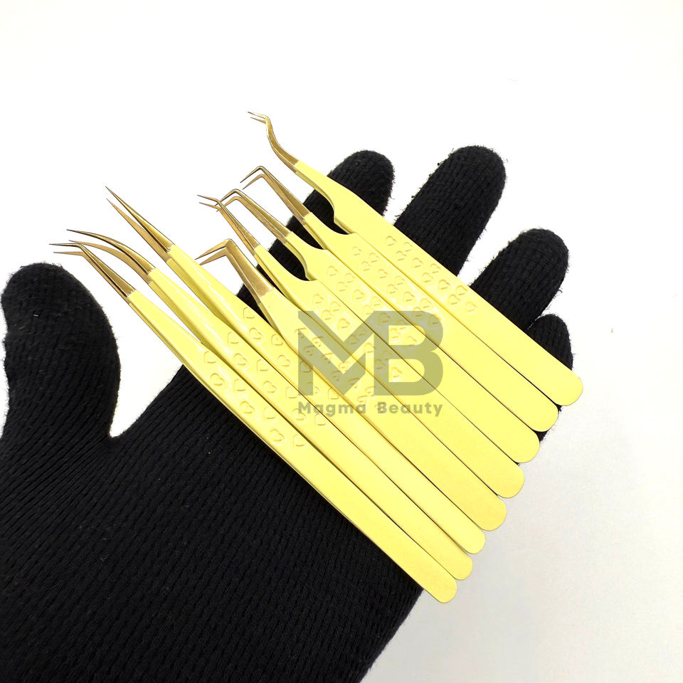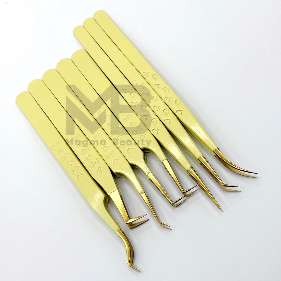 แหนบต่อขนตาที่หนีบรูปหัวใจเคลือบสีเหลืองอ่อนทำจากสเตนเลสสตีลจากญี่ปุ่นติดฉลากได้ตามต้องการ