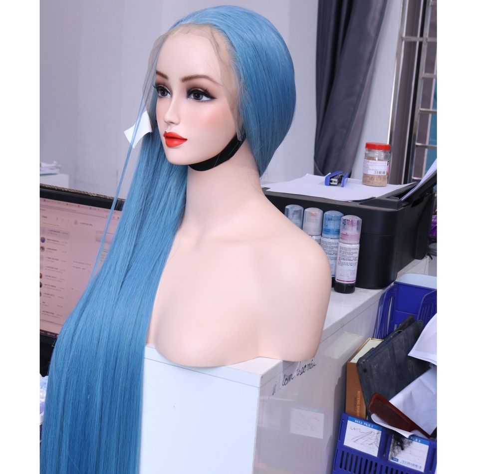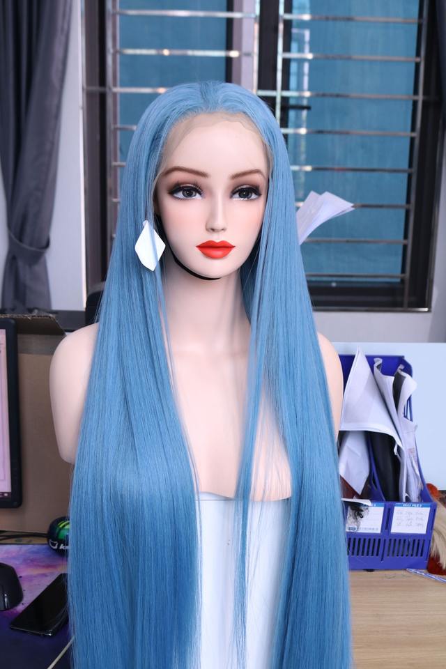 วิกผมตรงแบบมีลูกไม้ด้านหน้าคุณภาพระดับพรีเมี่ยมสีไอซ์บลูขนาด32นิ้วพร้อมหน้าผากสี13x6