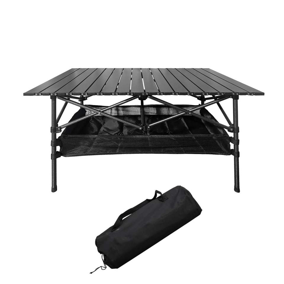 โต๊ะพับสำหรับตั้งแคมป์ ขนาด 46x22 นิ้ว น้ำหนักเบา ทำจากอลูมิเนียมและเหล็ก พกพาสะดวก ใช้เป็นโต๊ะข้างกลางแจ้งได้ มีพื้นที่จัดเก็บขนาดใหญ่ ดีไซน์พับเก็บได้