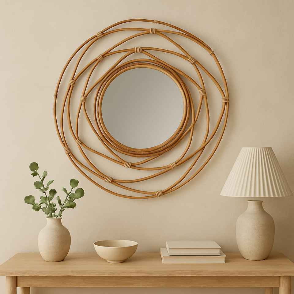 กระจกติดผนังกรอบหวายไม้ไผ่สไตล์เรโทรโบฮีเมียนน้ำหนักเบาคุณสมบัติการตกแต่งที่โดดเด่นสำหรับพื้นที่ที่มีลักษณะเฉพาะ