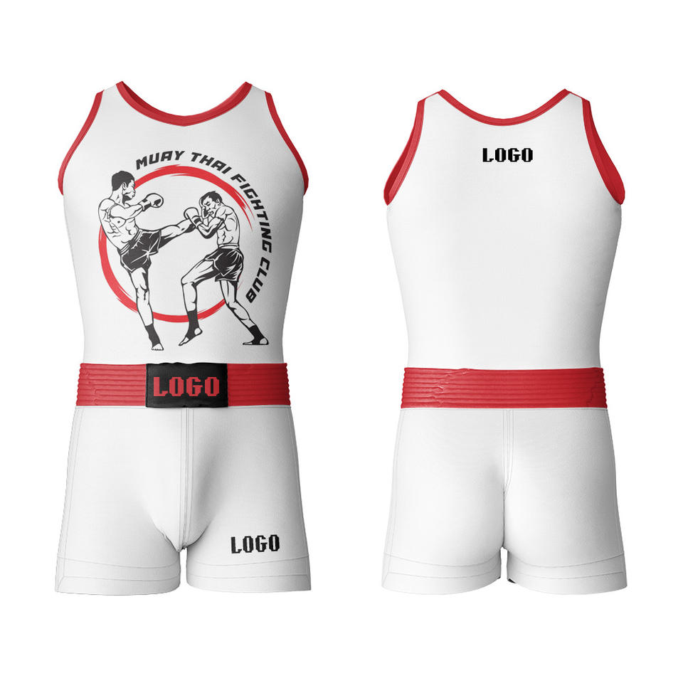 ชุดยูนิฟอร์มชกมวยน้ำหนักเบา ผลิตจากผ้าแห้งเร็ว กางเกงขาสั้นยืดได้ และเสื้อทรงพอดีตัว เหมาะสำหรับการแข่งขันชกมวย
