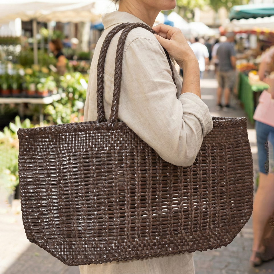 กระเป๋าโท้ทสานมือสีน้ำตาลเข้ม น้ำหนักเบา ทนทาน เป็นมิตรกับสิ่งแวดล้อม กันน้ำ บุด้วยหนังแท้ สายหนังถัก