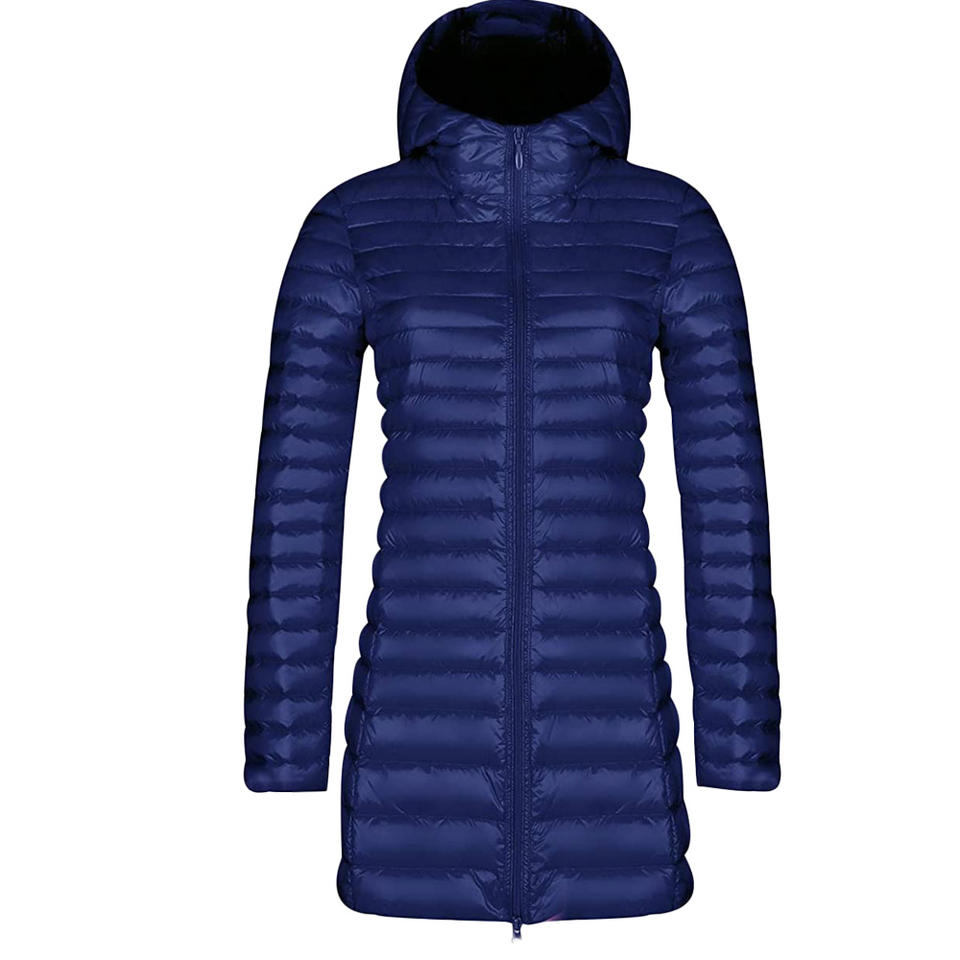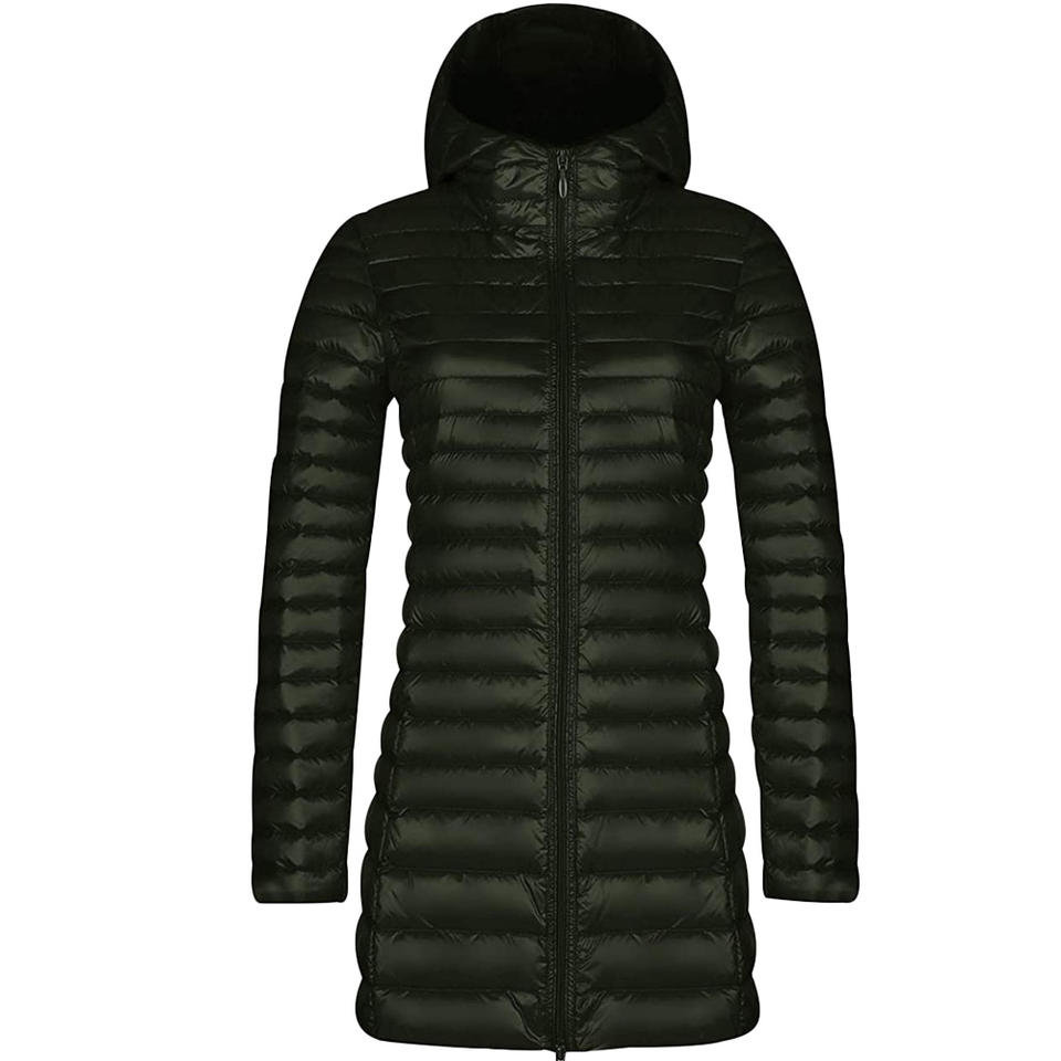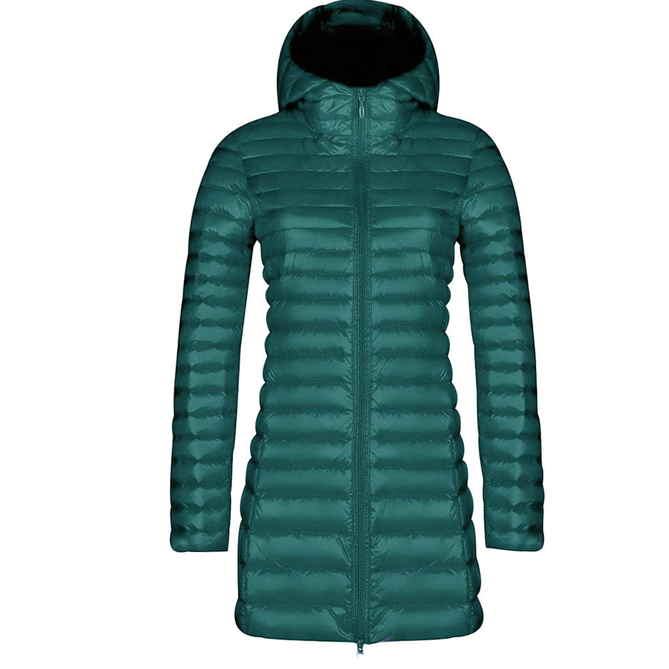เสื้อแจ็คเก็ตดาวน์ยาวเบามีฮู้ดสำหรับผู้หญิง,เสื้อแจ็คเก็ตแบบบุนวมมีฮู้ดน้ำหนักเบาพิเศษแพ็กได้สำหรับผู้หญิง
