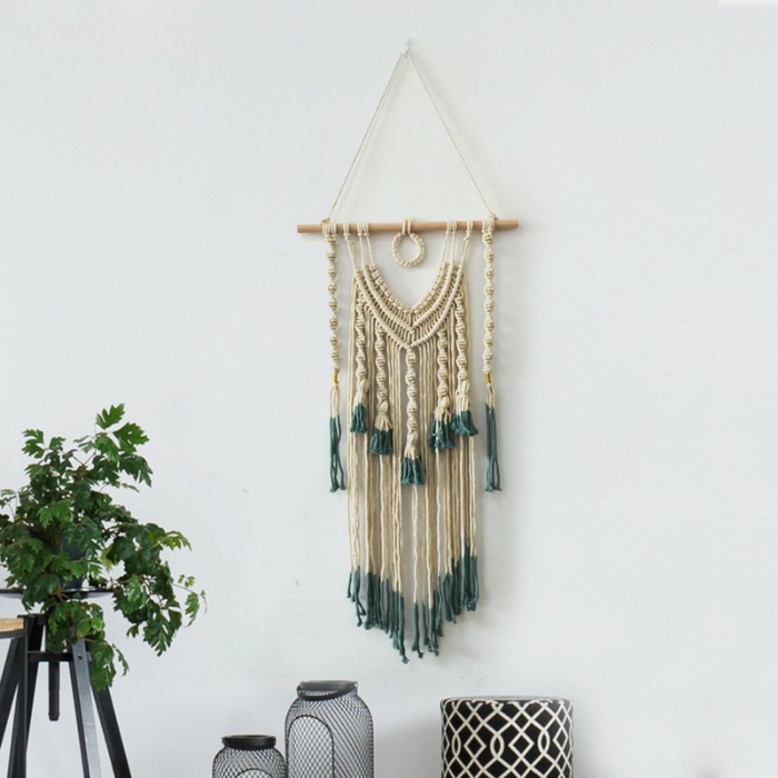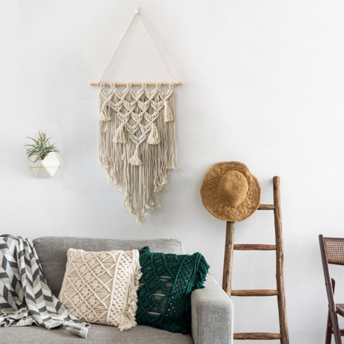 งานถักมาคราเม่ติดผนังน้ำหนักเบา ทำด้วยมือจากผ้าฝ้าย สำหรับตกแต่งห้องนั่งเล่น ผู้ส่งออกจากเวียดนาม พร้อมตัวเลือกปรับแต่งได้