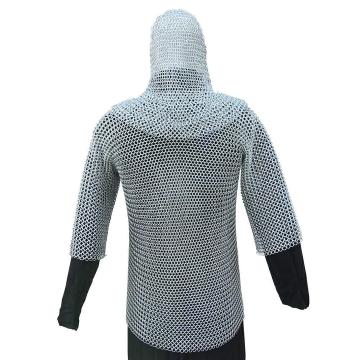 เสื้อลูกโซ่วงแหวนติดกระดุมทำจากอะลูมิเนียมขนาด10มม. พร้อมฮู้ดเกราะ Hauberk สำหรับใส่เครื่องแต่งกายและคอสเพลย์