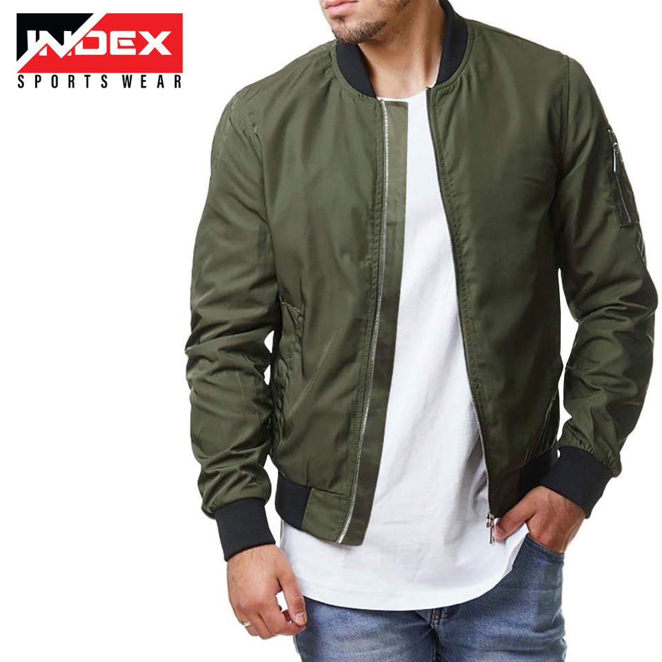 เสื้อแจ็คเก็ตบอมเบอร์ผู้ชายน้ำหนักเบา ผ้าฝ้าย 100% หลายกระเป๋า คอตั้ง สีเขียวทหาร พร้อมโลโก้สั่งทำ