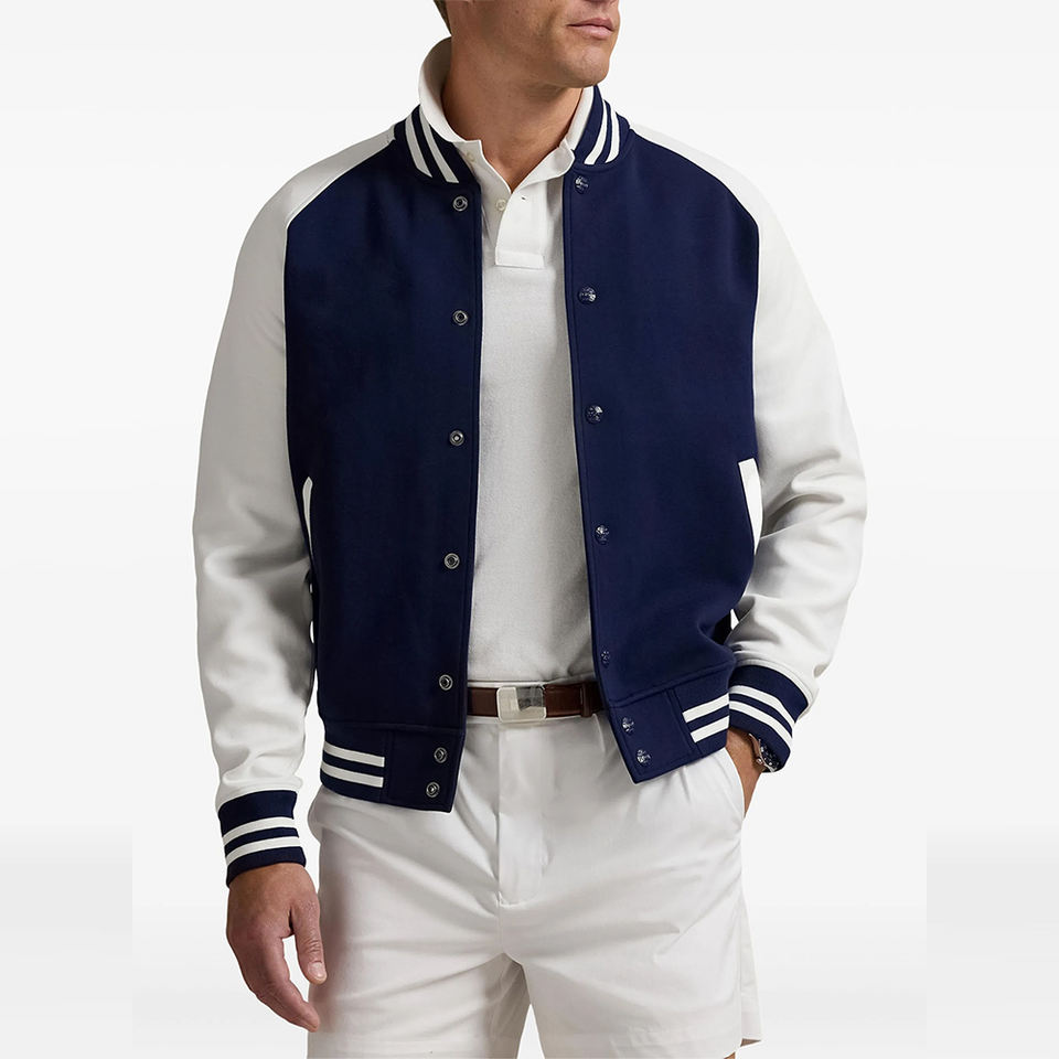 เสื้อแจ็คเก็ตวาร์ซิตี้ผู้ชายน้ำหนักเบา ผ้าเนื้อนุ่ม แขนเสื้อตัดกันสี พร้อมขอบยางยืดเรียบเนียนเพื่อความสบายในการสวมใส่ทุกวัน
