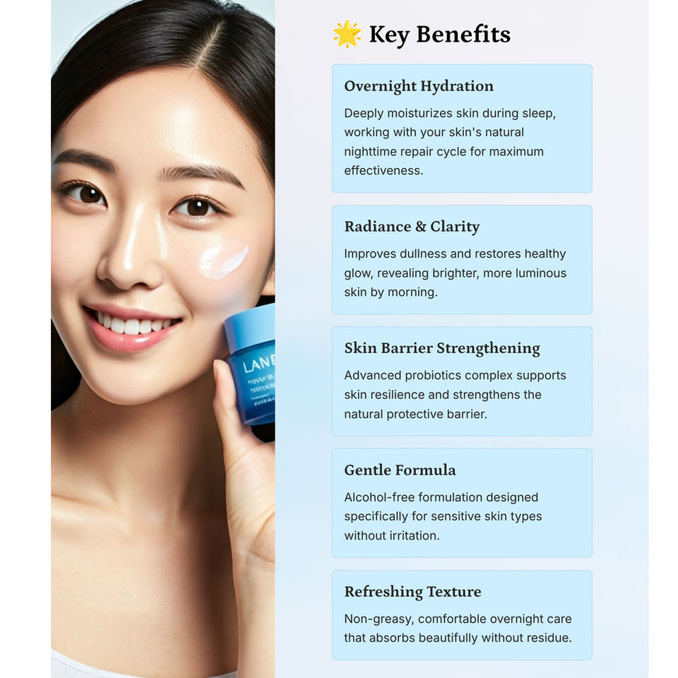 ส่วนผสม:แร่, กรดไฮยาลูโรนิก, โหดร้ายฟรี, สารเคมี, Overnight Mask, Moisturizing, Brightening, Firming, Probiotics