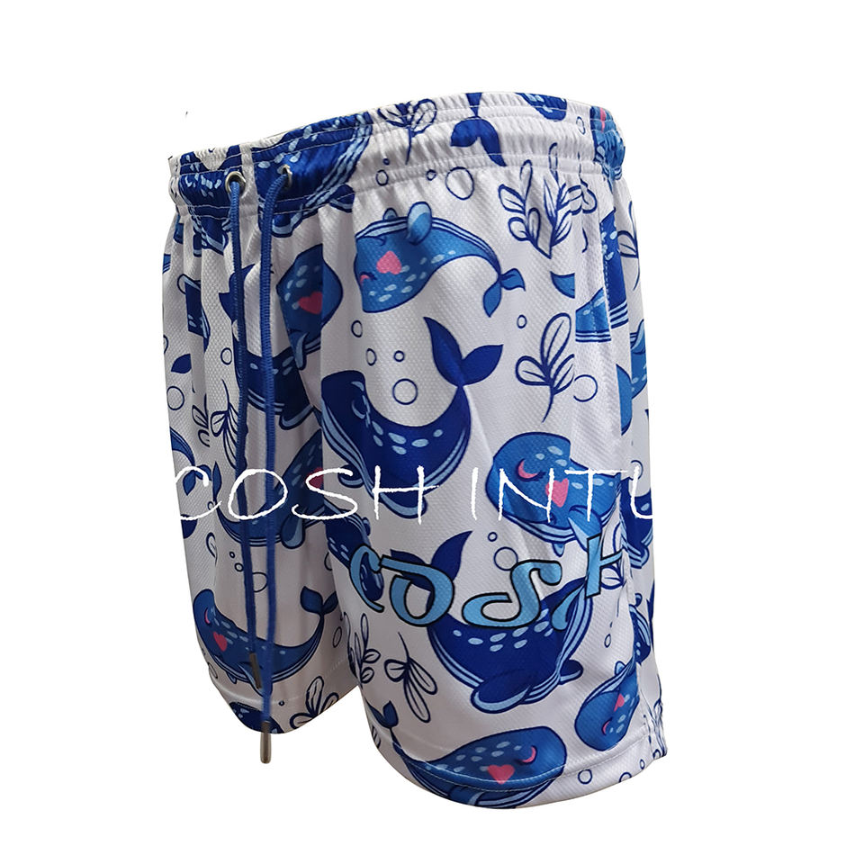 กางเกงว่ายน้ำขาสั้นลำลองพิมพ์ลายปลาวาฬสีฟ้าผ้าแห้งเร็วเป็นมิตรกับสิ่งแวดล้อมน้ำหนักเบาพิมพ์ลายตาข่ายแบบกำหนดเอง