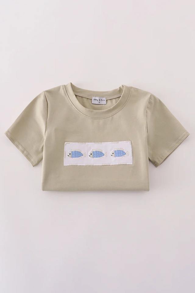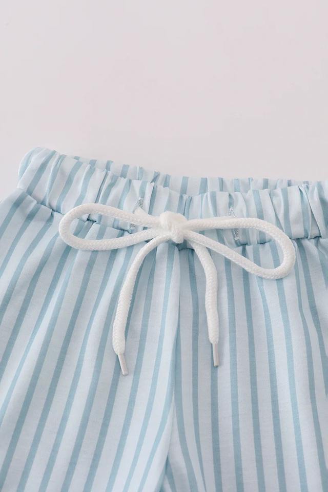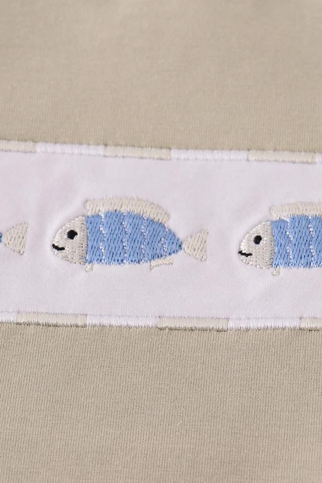 ชุดกางเกงขาสั้นผ้าสแปนเด็กซ์/คอตตอนลายทางสีน้ำเงิน ปักลายปลา สำหรับเด็กผู้ชาย สไตล์ลำลองสมาร์ท ชุดชายหาดฤดูร้อน เสื้อผ้าใส่สบาย