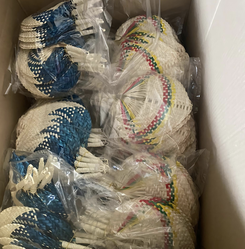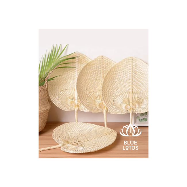 พัดลมมือน้ำหนักเบาทอจากใบปาล์มและดอกบัวหวายสีน้ำเงิน