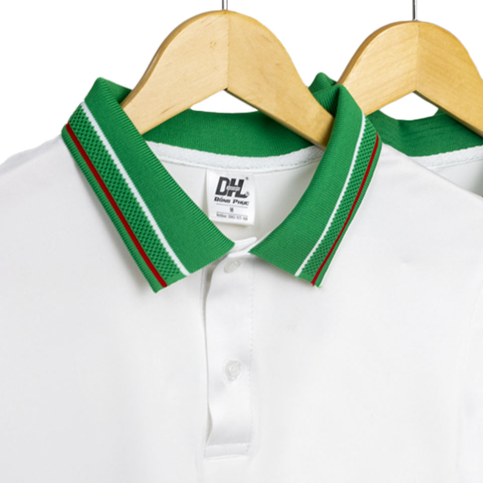 เสื้อโปโลสีขาวน้ำหนักเบา แต่งดีเทลสีเขียวอย่างมีสไตล์ ผ้าพรีเมียม ใส่สบาย เหมาะสำหรับชุดลำลองทางธุรกิจหรือชุดยูนิฟอร์มทีม