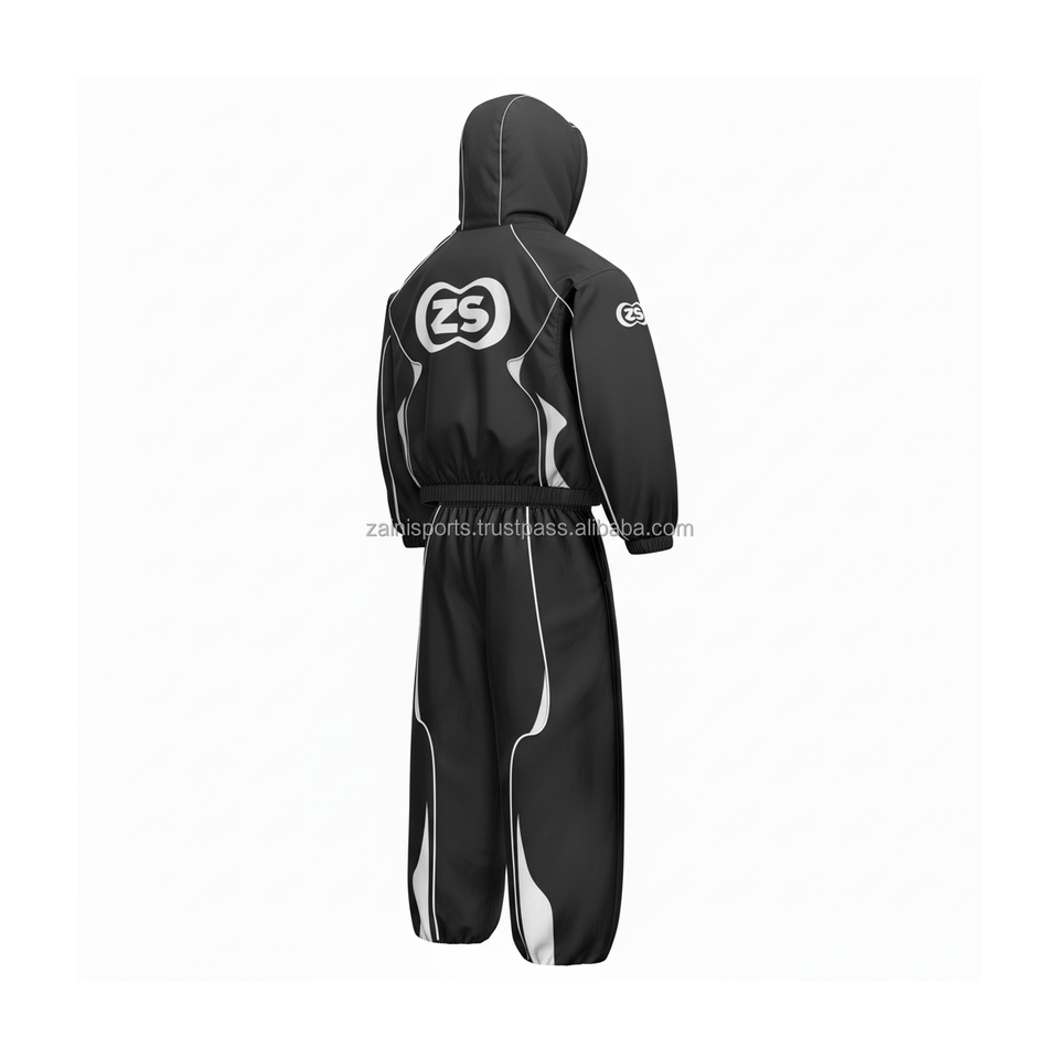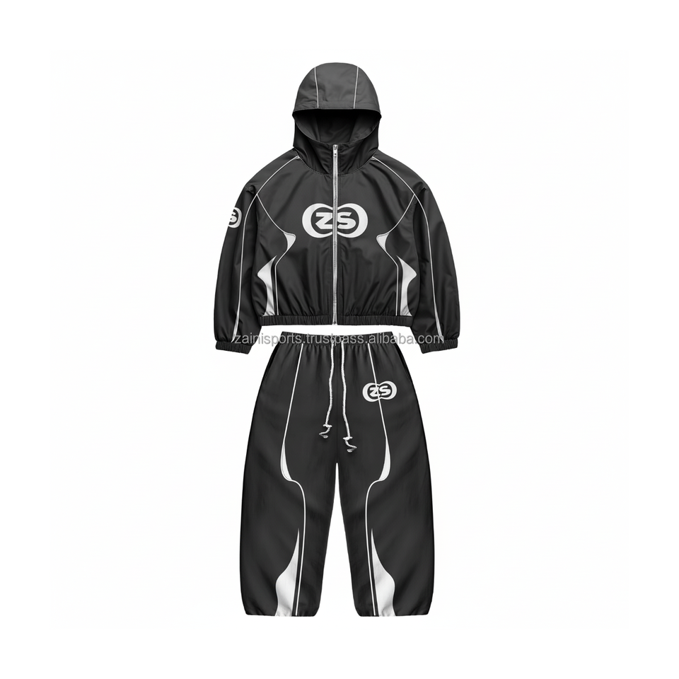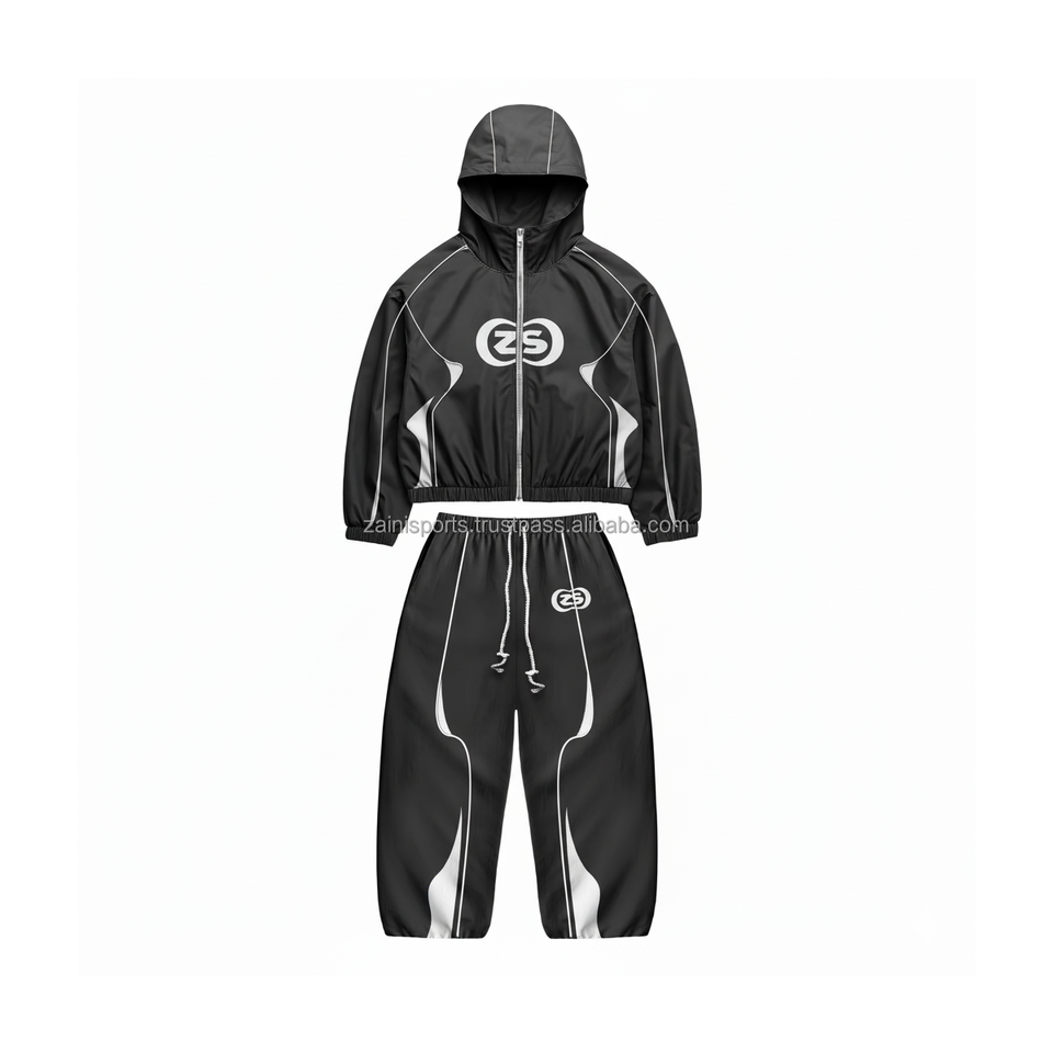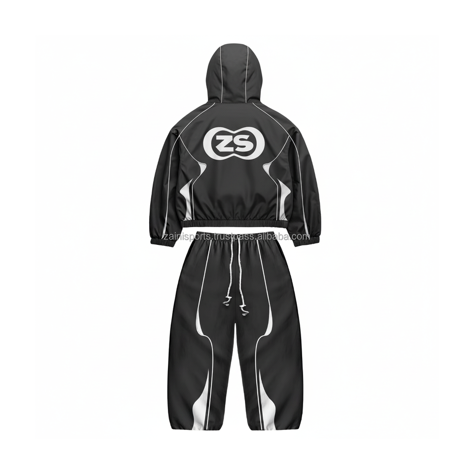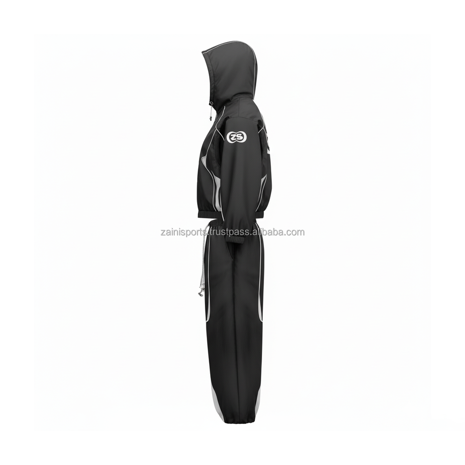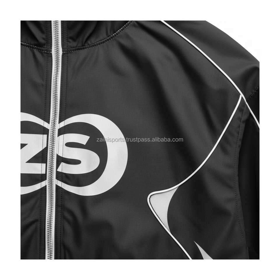 ชุดกันลมน้ำหนักเบา230GSM ผ้าไนลอนกันน้ำสีดำสีขาวแผงด้านข้างพิมพ์โลโก้หน้าจอขนาดพิเศษออกแบบได้ตามต้องการ