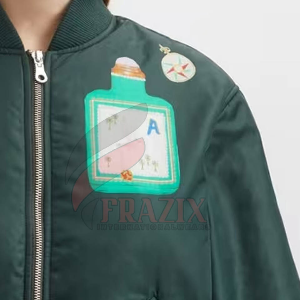 แจ็คเก็ตบอมเบอร์ผ้าซาตินน้ำหนักเบาสำหรับฤดูหนาว พร้อมแพทช์ปักลายสไตล์วินเทจ คอตั้ง ดีไซน์ยูนิเซ็กซ์ และแพทช์ลายเฉพาะตัว