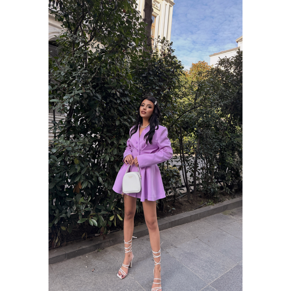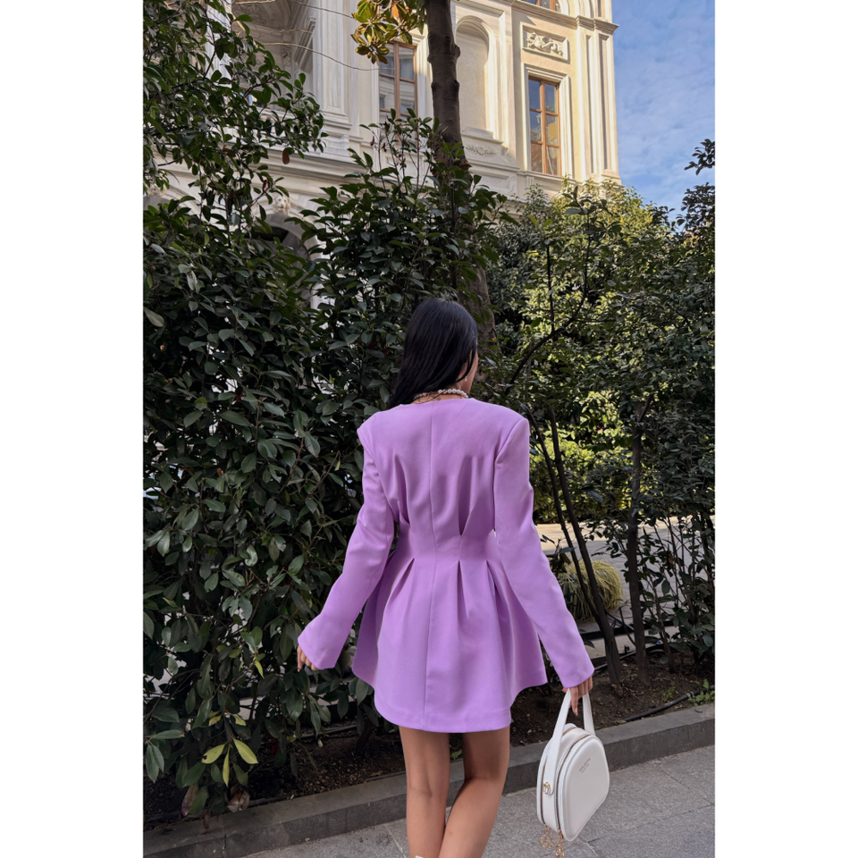ชุดเดรสสีม่วงไลแลคพร้อมแจ็คเก็ตตกแต่งด้วยดีเทลลายดาตส์