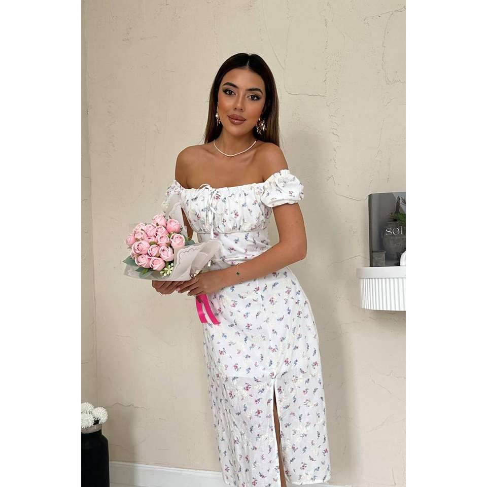 ชุดเดรสลายดอกไลแลคสำหรับฤดูร้อน แบบเปิดไหล่ ทรงเอไลน์ เอวธรรมชาติ ผ้าทอระบายอากาศได้ดี เหมาะสำหรับใส่ในชีวิตประจำวัน