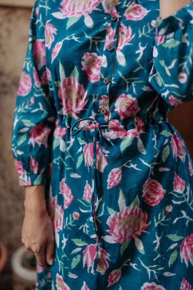 ชุดเดรสผ้าฝ้ายพิมพ์ลายด้วยมือลิลิโอซา สีฟ้าขาว ลายดอกไม้ สไตล์โบฮีเมียน สำหรับฤดูร้อน