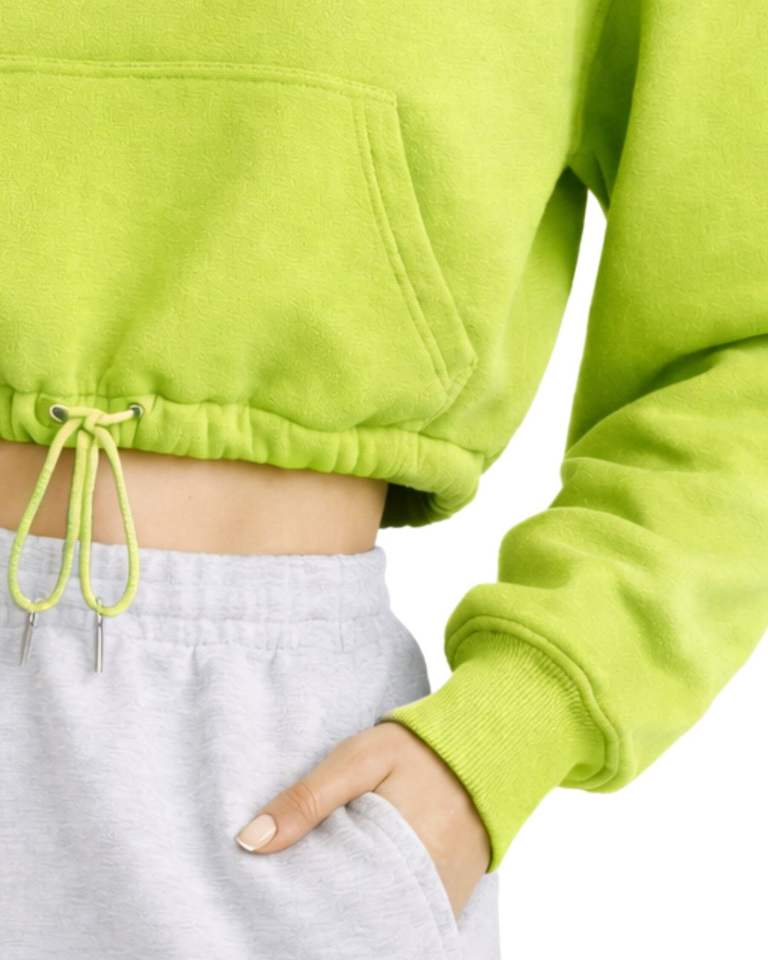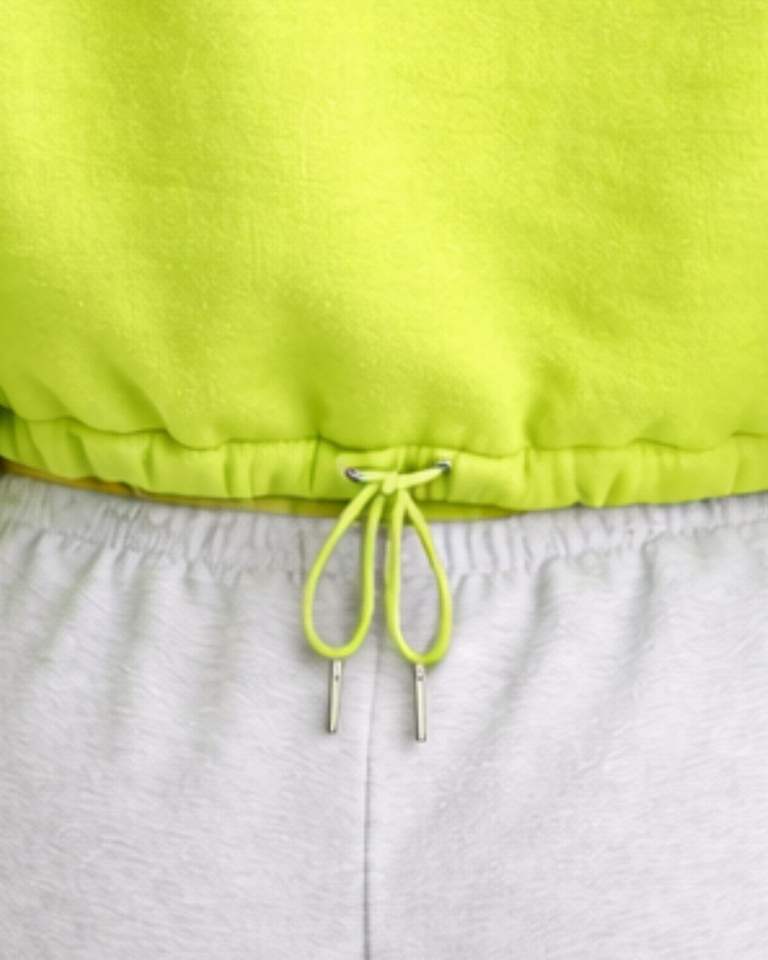 เสื้อฮู้ดครอปสีเขียวมะนาว ผ้าฟลีซ ซิป ¼ กระเป๋าคางูโร ชายเสื้อปรับได้ด้วยเชือกผูก สไตล์ลำลอง สตรีทแวร์ ให้ความอบอุ่น เสื้อพูลโอเวอร์สำหรับผู้หญิง