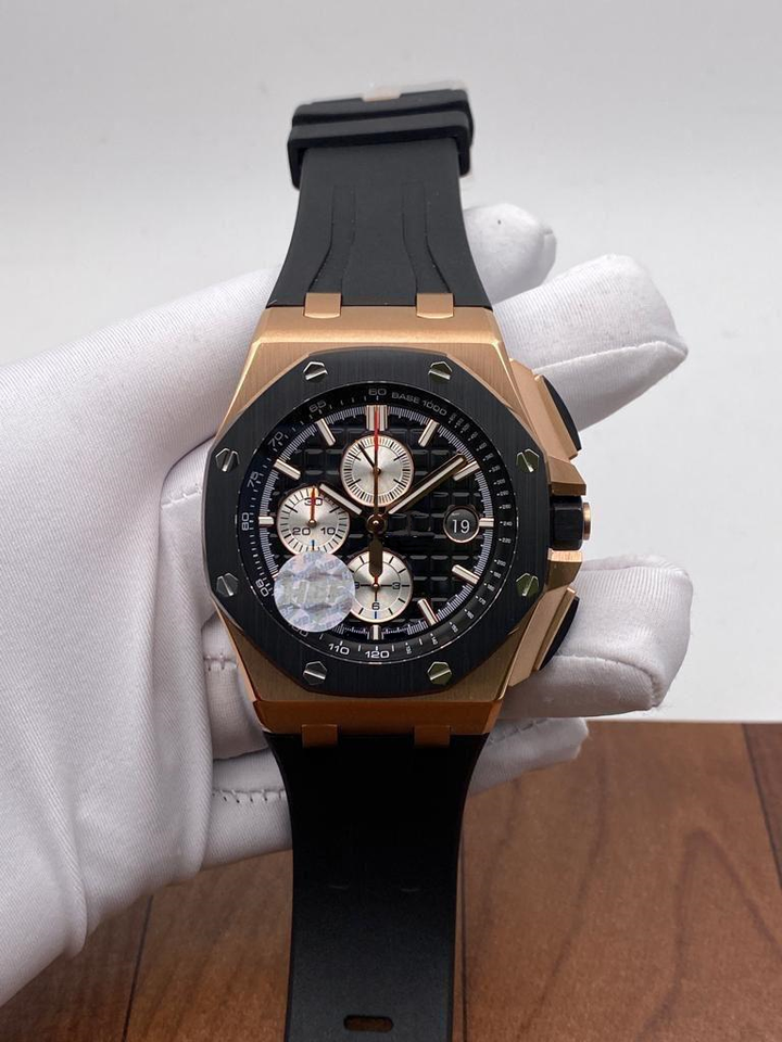 นาฬิกาโครโนกราฟโทนสีโรสโกลด์รุ่นลิมิเต็ดอิดิชั่น หน้าปัดสีดำลายเท็กซ์เจอร์ ขอบตัวเรือนทรงแปดเหลี่ยม แสดงวันที่ สไตล์สตรีท ETA
