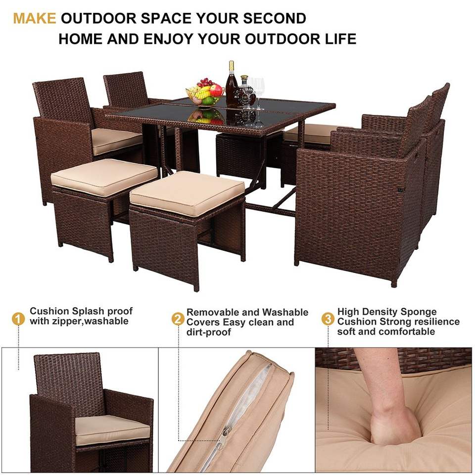 เซ็ตโต๊ะกระจกนิรภัย9ชิ้นทำจากหวาย PE หวายสำหรับรับประทานอาหารออตโตมันสำหรับสวน