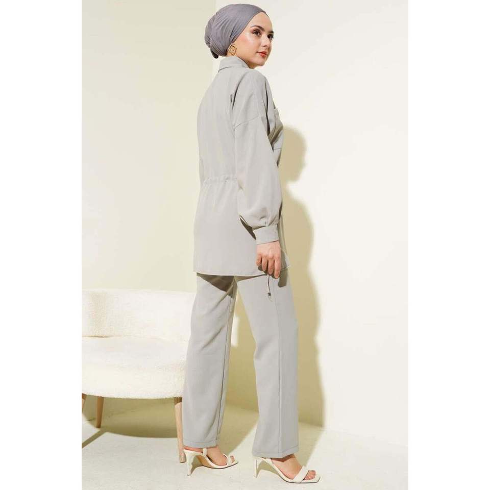 ชุดลินดา2ชิ้นพร้อมช่องคาดเอวและเชือกผูกสีเทา