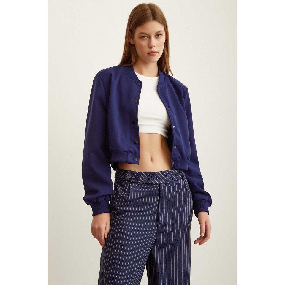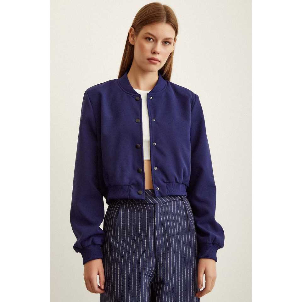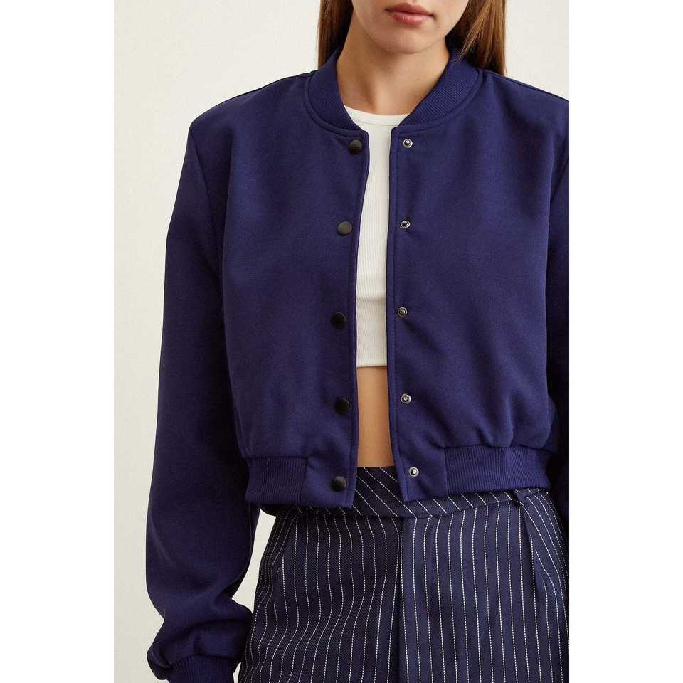เสื้อแจ็คเก็ตบอมเบอร์มีซับใน สีกรมท่า แขนยาว บุด้วยโพลีเอสเตอร์ สำหรับฤดูใบไม้ร่วง เสื้อแจ็คเก็ตผู้หญิง