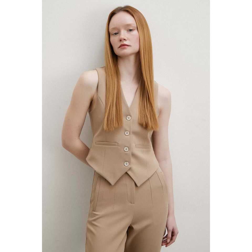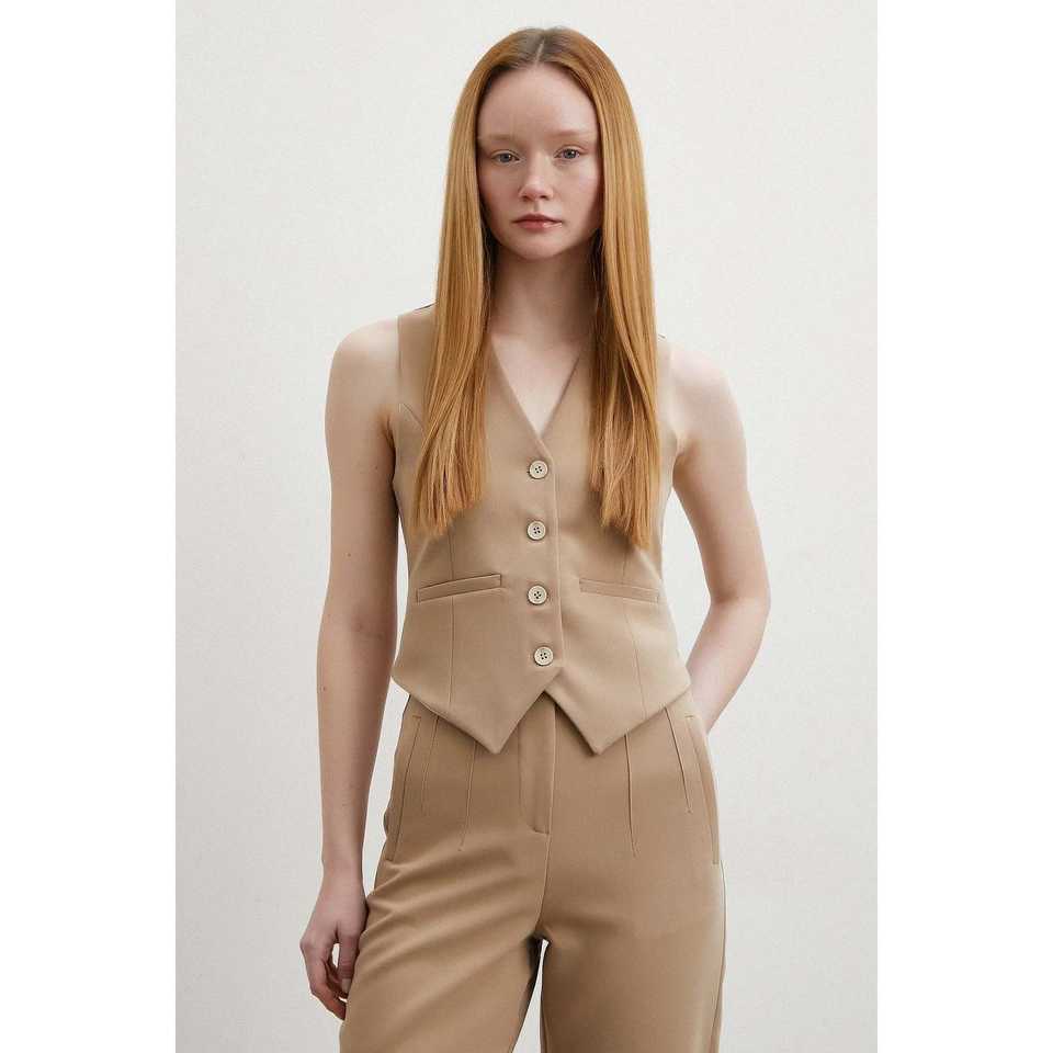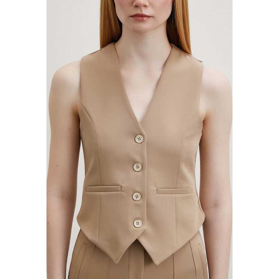 เสื้อกั๊กมีซับในสำหรับผู้หญิง สีเบจ พร้อมเข็มขัด