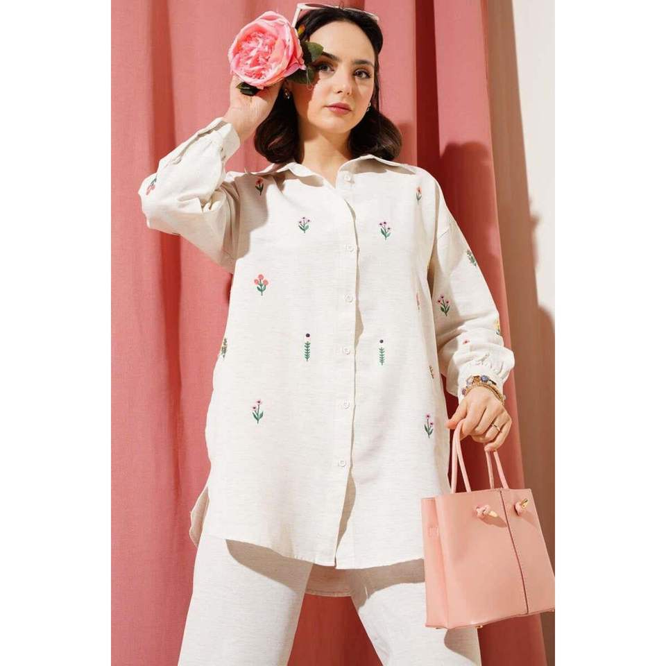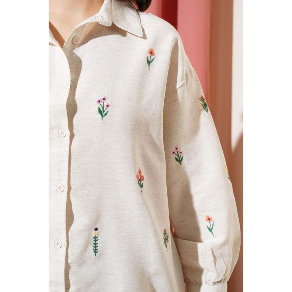 ชุดผ้าลินิน2ชิ้นปักลายดอกไม้ขนาดเล็กสีเบจด้านหน้า