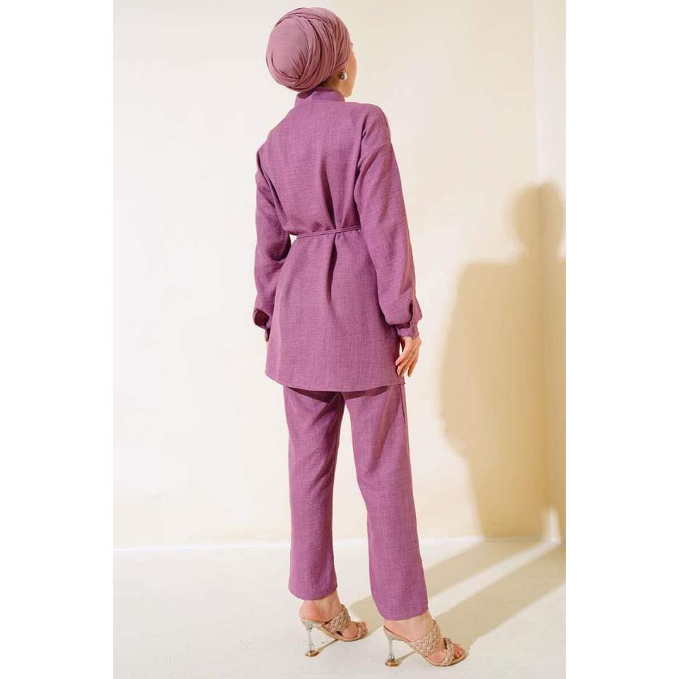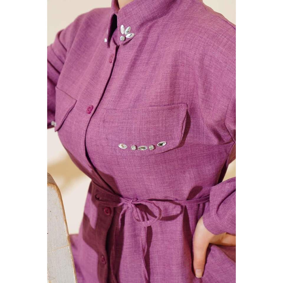 ผ้าลินิน2ชิ้นชุดที่มีรายละเอียดกระเป๋าหินสีกุหลาบฝุ่น