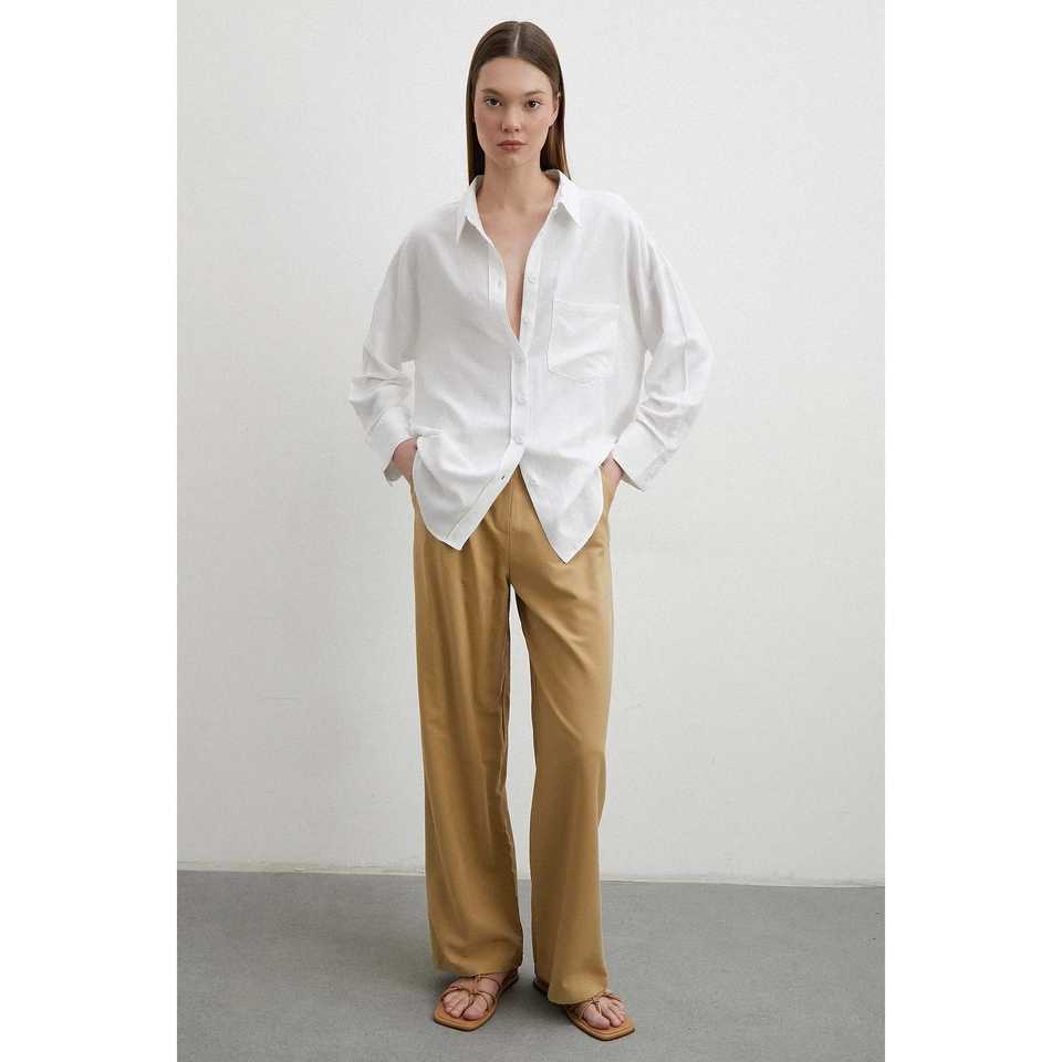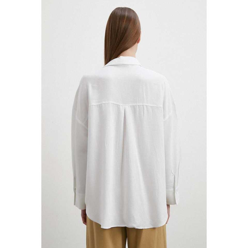 เสื้อเชิ้ตผ้าลินินผสมสีขาวติดกระดุมสำหรับผู้หญิง สไตล์มินิมอลสำหรับใส่ทุกวัน
