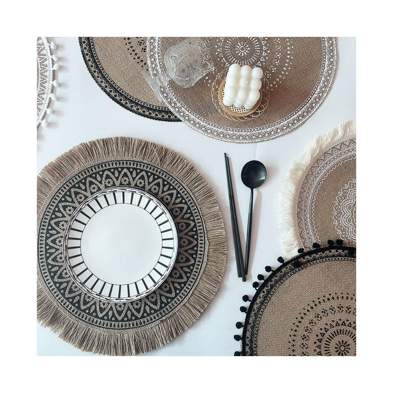 แผ่นรองจานผ้าฝ้ายผ้าลินินทรงกลมโบฮีเมียนทำด้วยมือทนทานสำหรับตกแต่งโต๊ะสำหรับงานแต่งงานที่รองจานกระดาษทำด้วยมือ