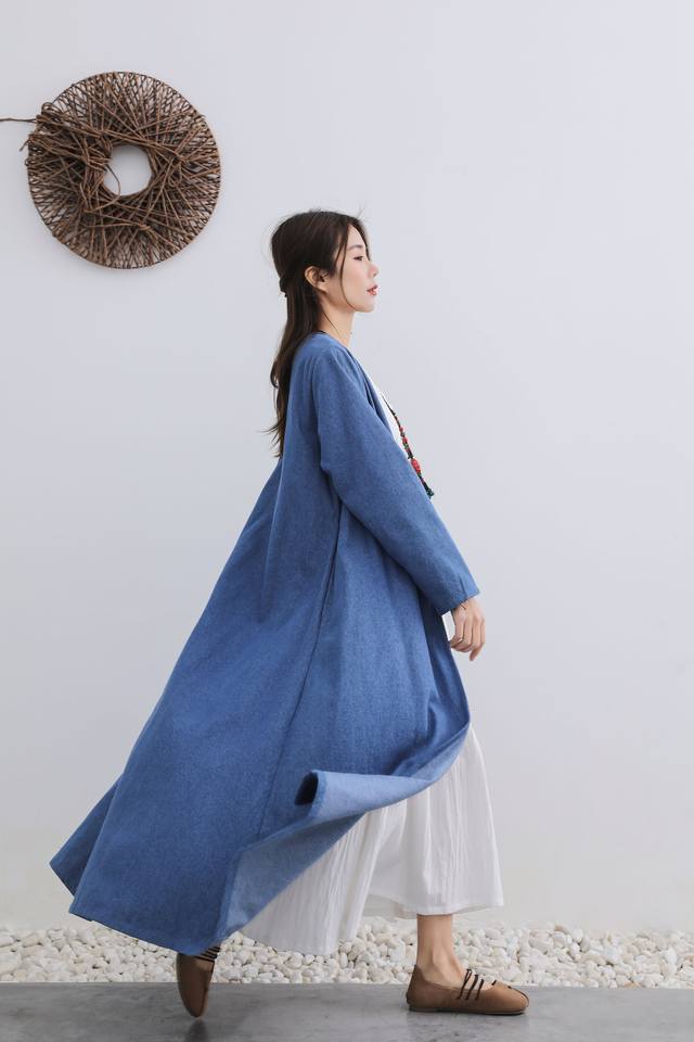 เดรสยาวผ้าลินินผสมคอตตอนทรงหลวมสไตล์ลำลองสำหรับผู้หญิง คอวี ผ้าเดนิม เหมาะสำหรับฤดูร้อน