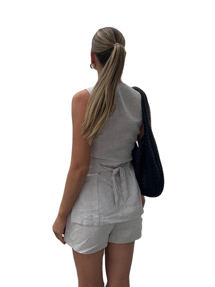 ชุดเสื้อกั๊ก & กางเกงขาสั้นผ้าลินินผ้าฝ้ายชุดสองชิ้นแบบเรียบง่ายชุดเลานจ์เรียบง่ายระบายอากาศได้ชุด2026ลำลองสำหรับวันหยุดพักผ่อนรีสอร์ท