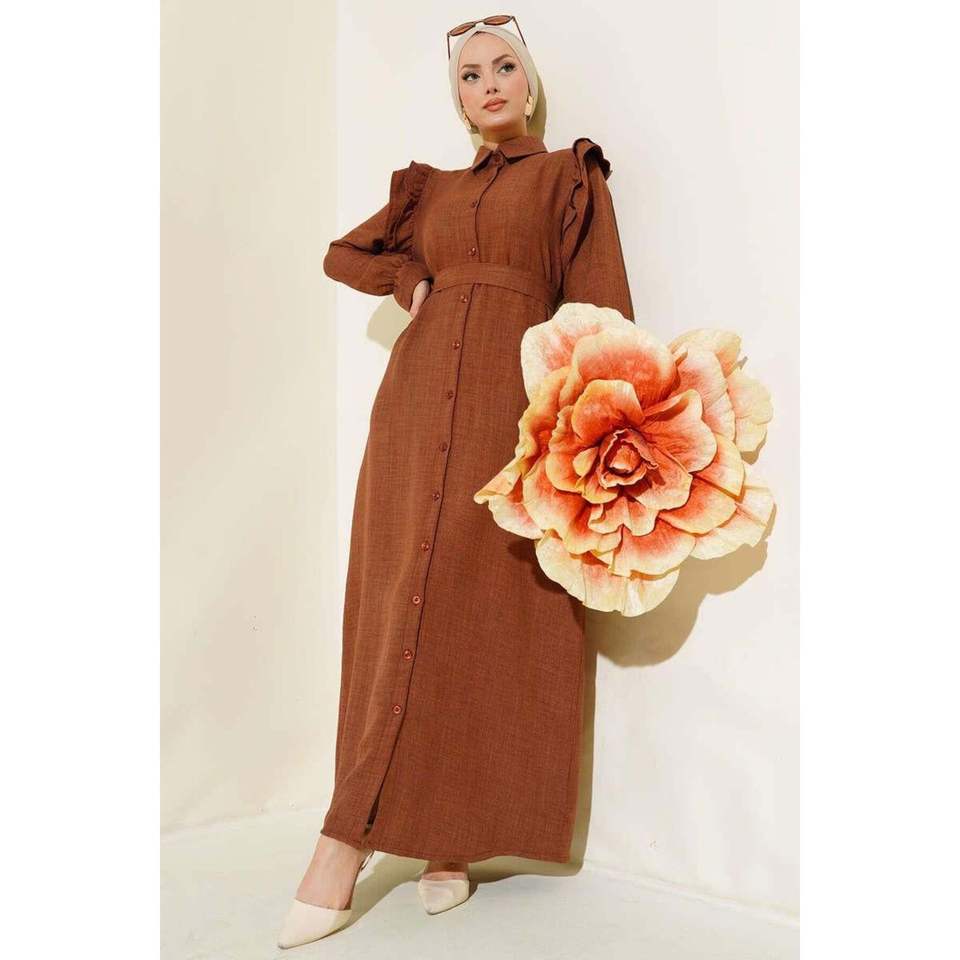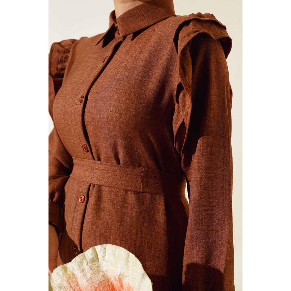 ชุดผ้าลินินไหล่มีระบายสีน้ำตาล