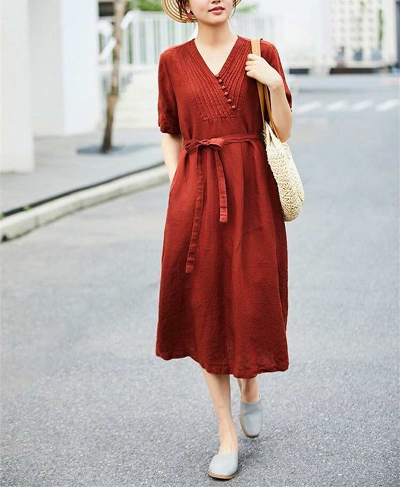 ชื่อผลิตภัณฑ์:ชุดผ้าลินินสีแดง MIDI