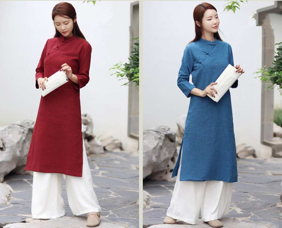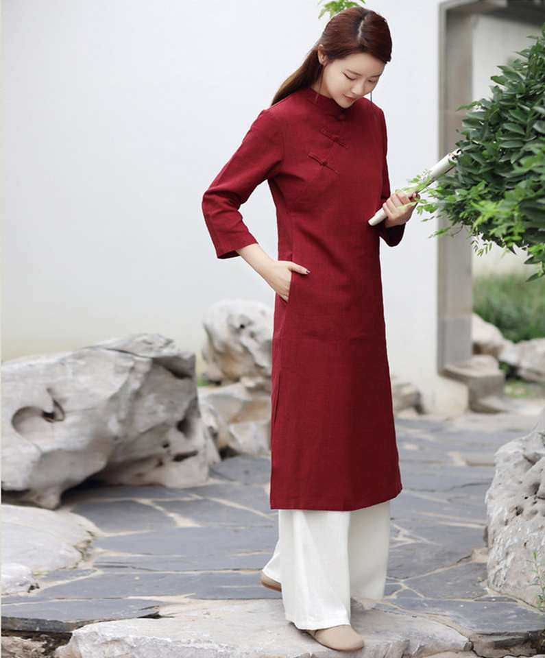 Product Name:Linen Midi Dress Long Sleeve Tunic Robes Dress