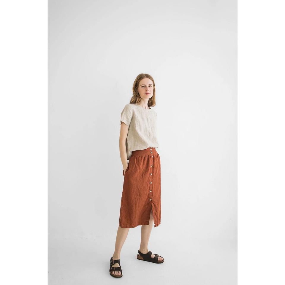 กระโปรงผ้าลินินยาวถึงเข่ากระโปรงผ้าลินินเอวสูงสำหรับผู้หญิงกระโปรงฤดูใบไม้ผลิ