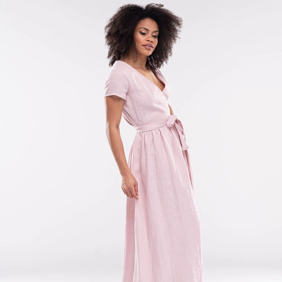 ชุดแมกซี่เดรสแต่งงานผ้าลินินสุภาพเรียบร้อยสำหรับผู้หญิงเดรสยาวผูกเอวแขนสั้นผ้าลินินพันรอบที่เป็นมิตรต่อสิ่งแวดล้อม
