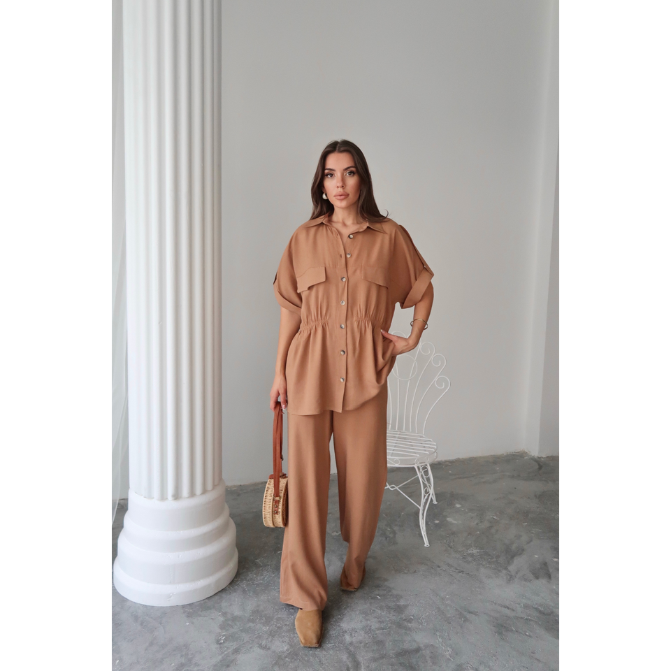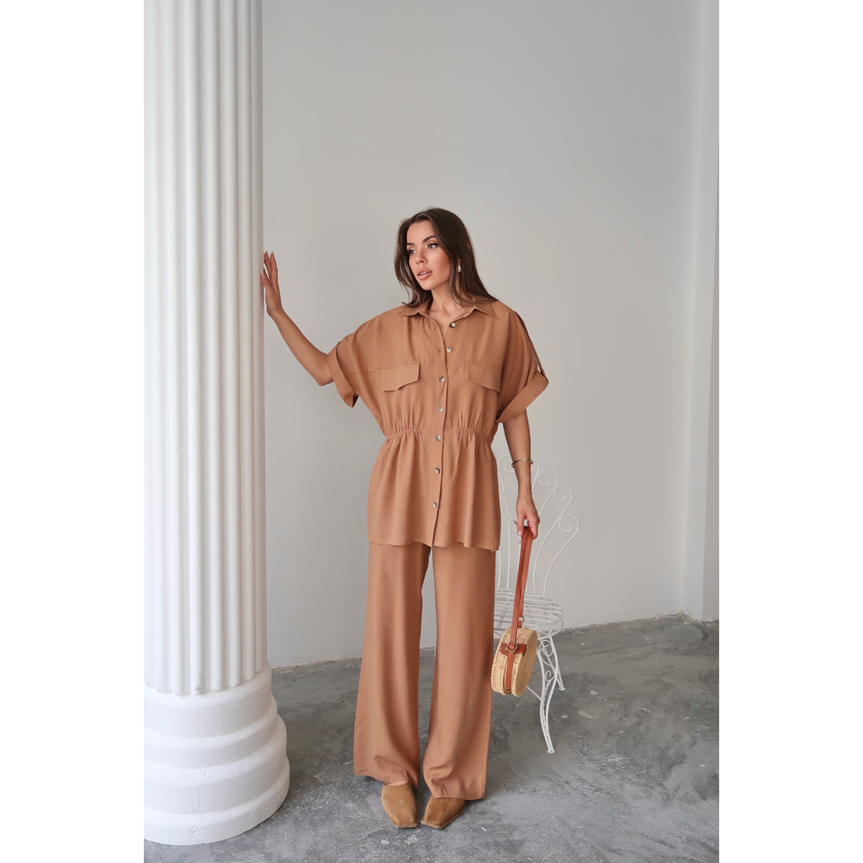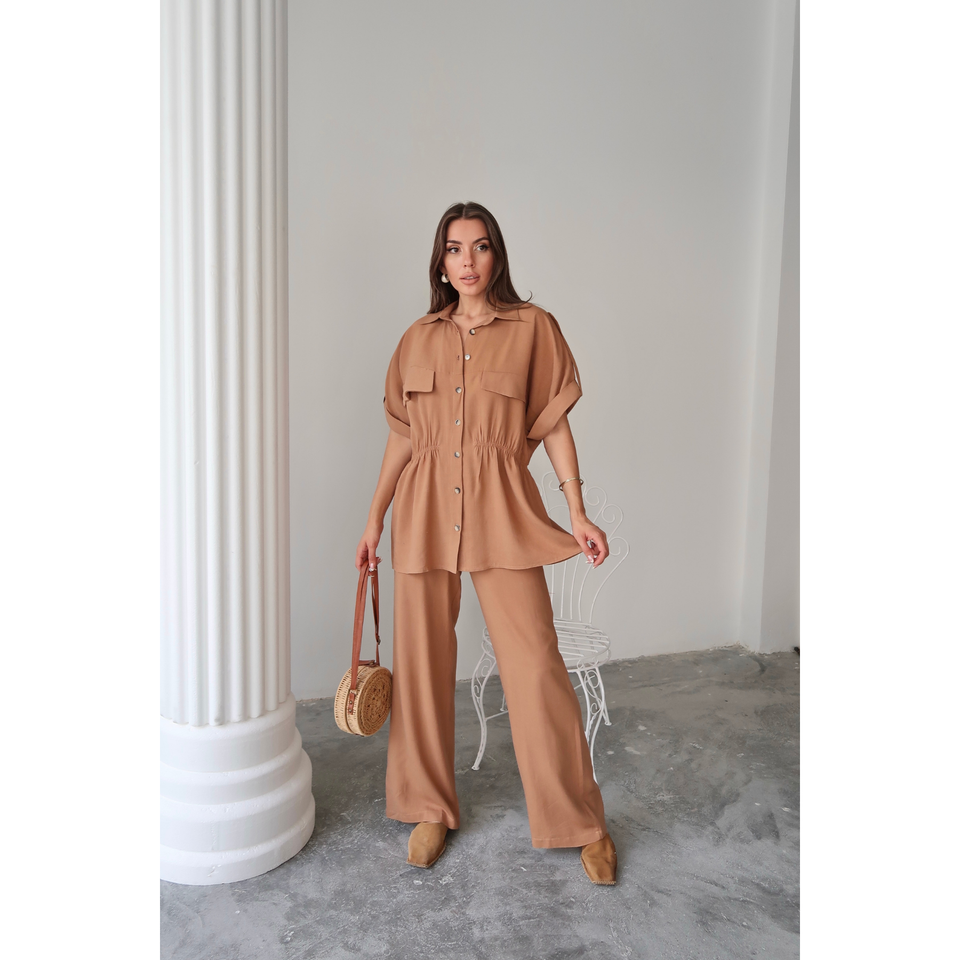 ชุดเสื้อเชิ้ตผ้าลินินและกางเกงขายาวสีน้ำตาลเอวผูกเชือก ชุดผู้หญิงไซส์ S