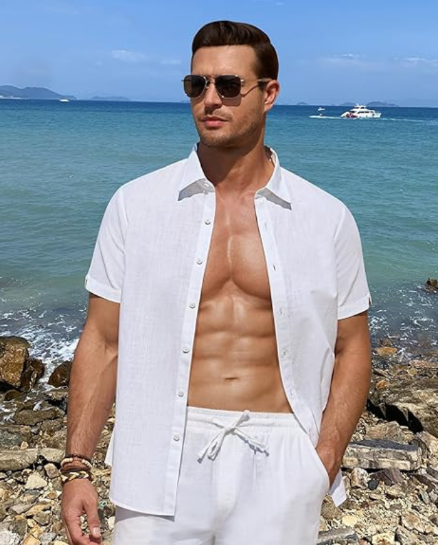 เสื้อเชิ้ตผ้าลินินสำหรับผู้ชายแขนสั้นมีกระดุมเสื้อแบบลำลองสำหรับใส่ในฤดูร้อนชายหาดเสื้อสำหรับวันหยุดงานแต่งงาน