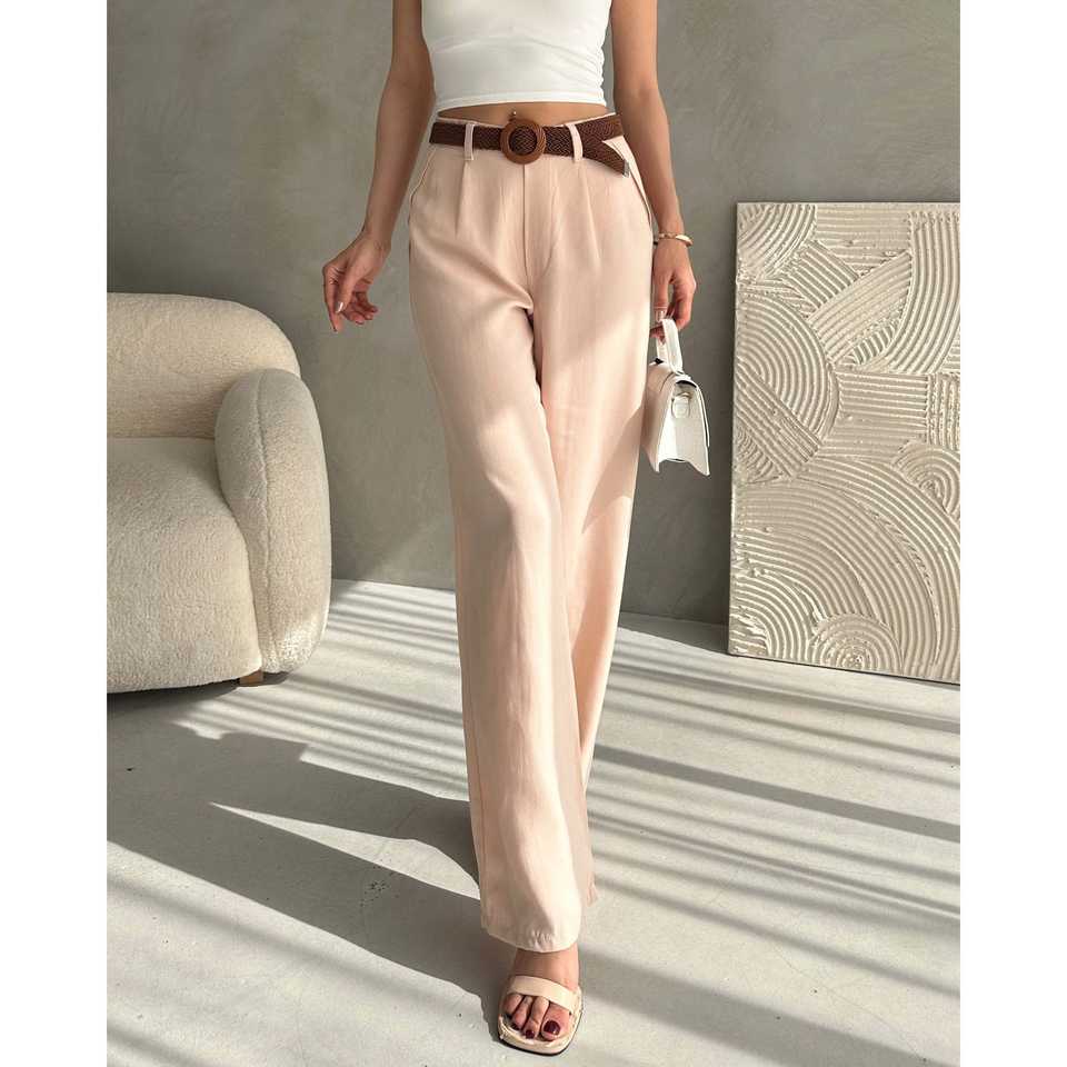 กางเกงขายาวผ้าลินินเอวสูงระบายอากาศได้ดีสำหรับผู้หญิงสีขาว