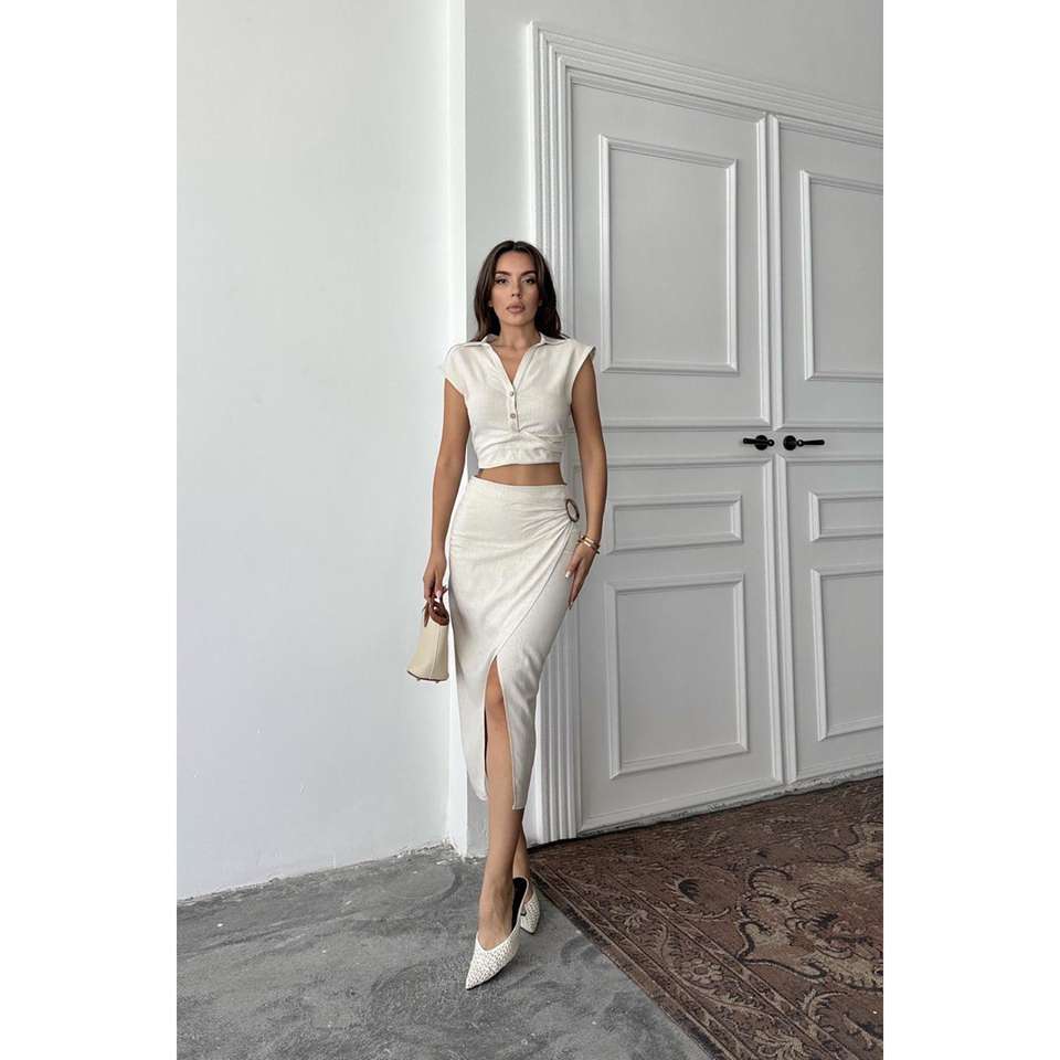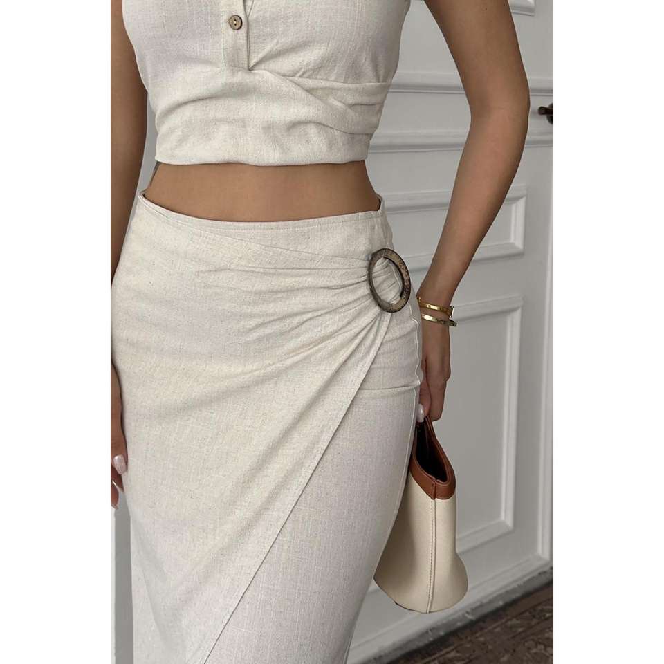 ชุดเสื้อและกระโปรงผ้าลินินสำหรับผู้หญิง สีเบจ เสื้อครอปท็อประบายอากาศได้ดี พร้อมกระโปรงมิดิเอวสูงทรงเอ สำหรับชุดฤดูร้อน