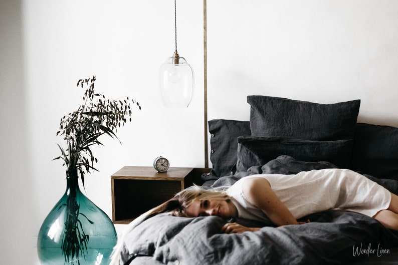 ชุดเครื่องนอนผ้าลินินเย็บด้วยมือขนาดควีนไซส์-ปลอกหมอนปลอกผ้านวมสีเทา200tc ด้ายสีทึบปิดกระดุม2เม็ด