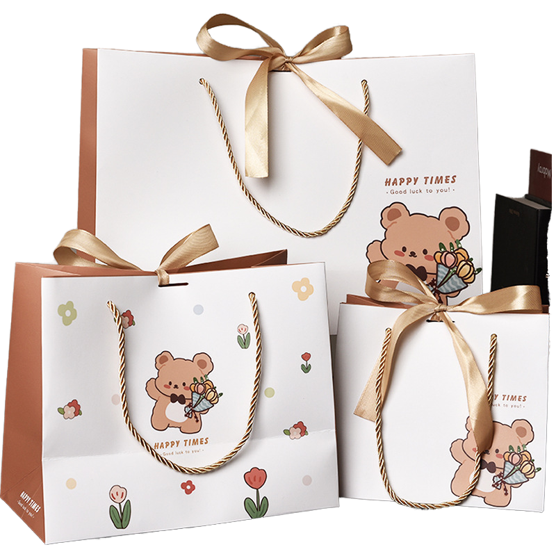 ถุงของขวัญกระดาษคราฟท์ลายหมีน้อยคลาสสิกสำหรับวันเด็ก พร้อมหูหิ้วริบบิ้น สำหรับงานนิทรรศการและซูเปอร์มาร์เก็ต ใช้บรรจุขนม