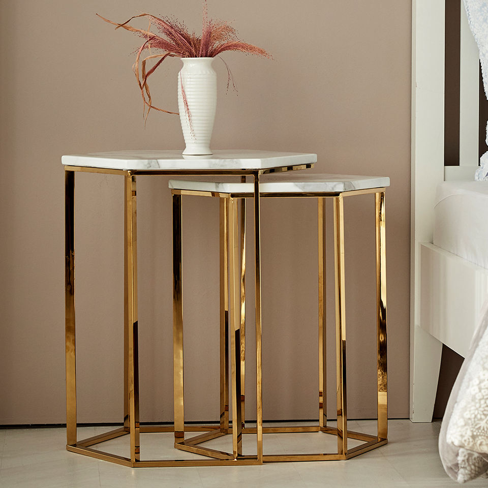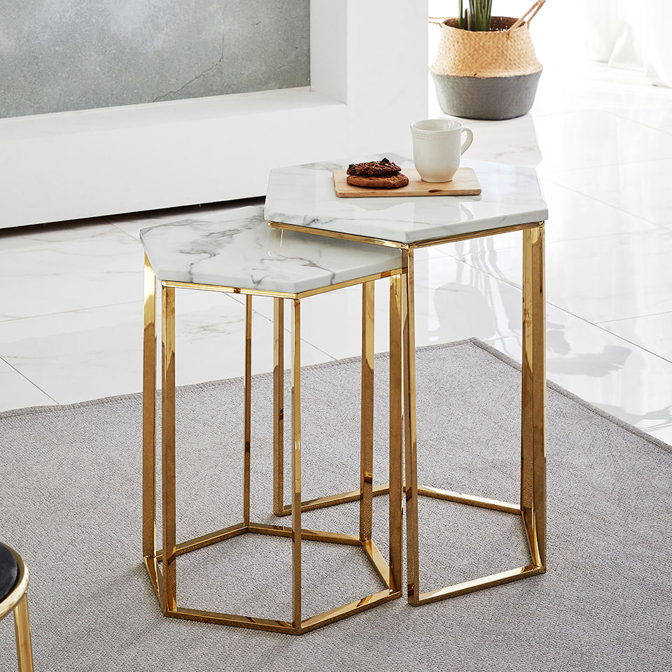 ชุดโต๊ะกาแฟรูปทรงหินอ่อนสีขาวขาโต๊ะทำจากเหล็กเข้ามุมห้องนั่งเล่นทำจากโลหะสีทองทำจากสแตนเลส